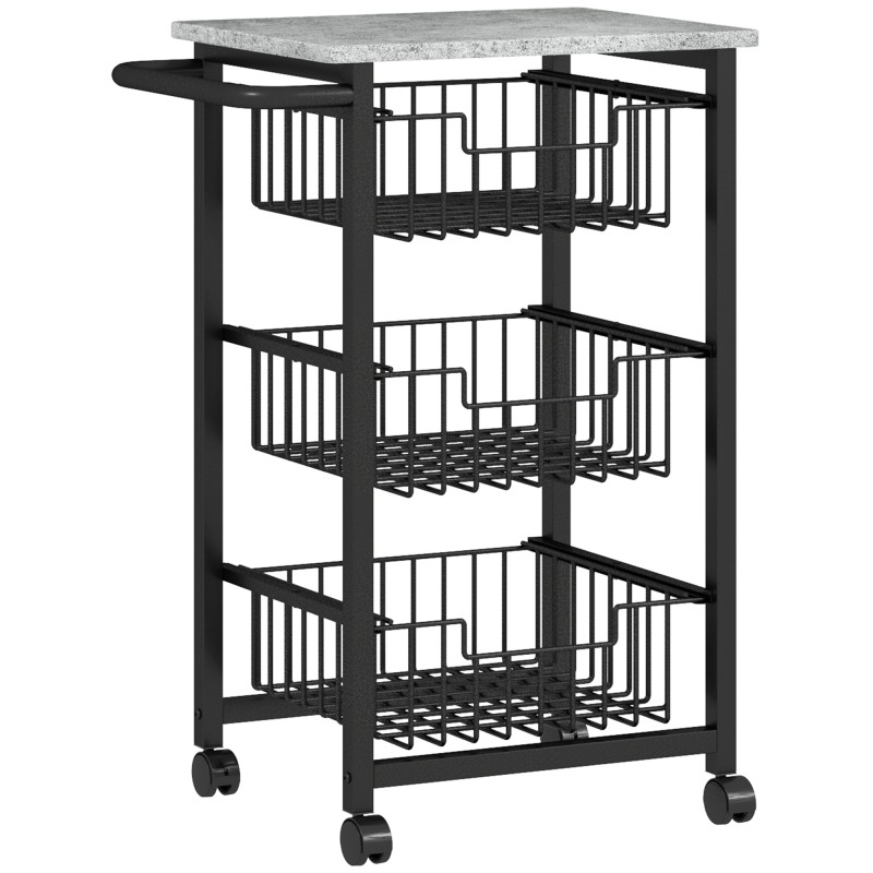 Tämä kolmikerroksinen keittiövaunu helpottaa arjen järjestelyä ja tarjoilua. Kompaktin kokonsa, liikuteltavien teräskorien ja tukevan työtason ansiosta säilytät hedelmät, vihannekset, mausteet ja pientarvikkeet siististi käden ulottuvilla – juuri siellä missä niitä tarvitset.