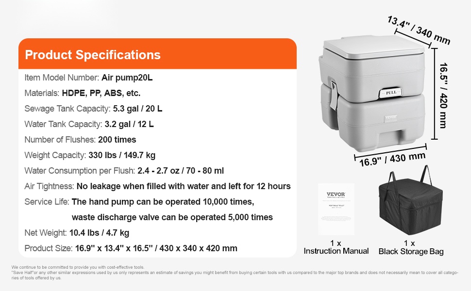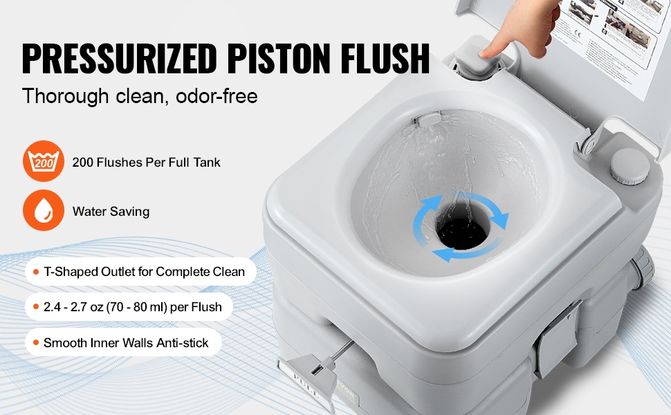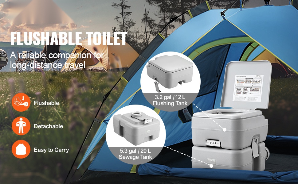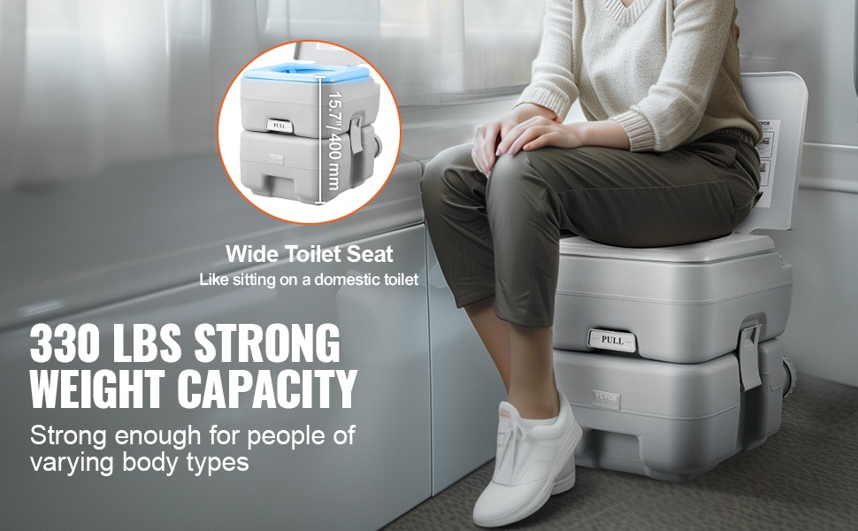 Tämä kantokelpoinen wc on kätevä ratkaisu retkeilyyn, matkailuautoihin, veneisiin, kuorma-autoihin ja muuhun ulkoilukäyttöön. Jätevesisäiliön tilavuus on 5.3 gal / 20 L, joten wc soveltuu hyvin myös pidemmille matkoille.