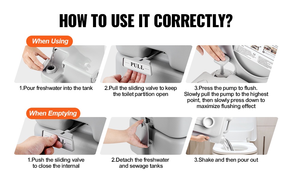 Käyttöönotto on yksinkertaista: täytä säiliö vedellä, vedä liukuventtiili auki wc-osaston avaamiseksi, ja wc on heti käyttövalmis.