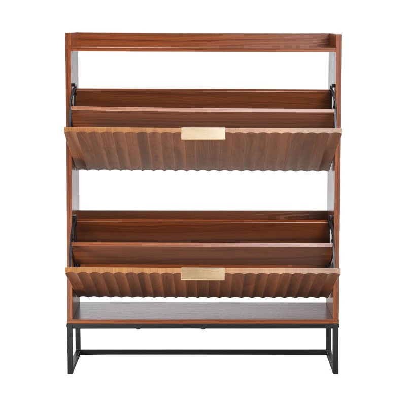 Lämminsävyinen pähkinäviimeistely, metallivetimet ja metalliset tukijalat tuovat vakautta ja klassista ilmettä. Alahyllyyn tai avoimeen osioon mahtuvat arjen tossut ja kengät, jolloin tyyli ja käytännöllisyys yhdistyvät.