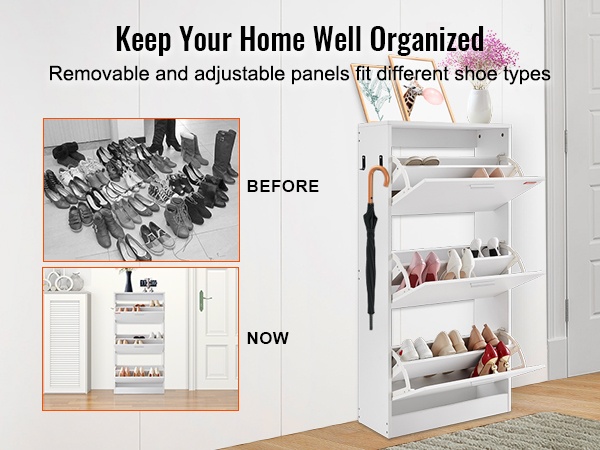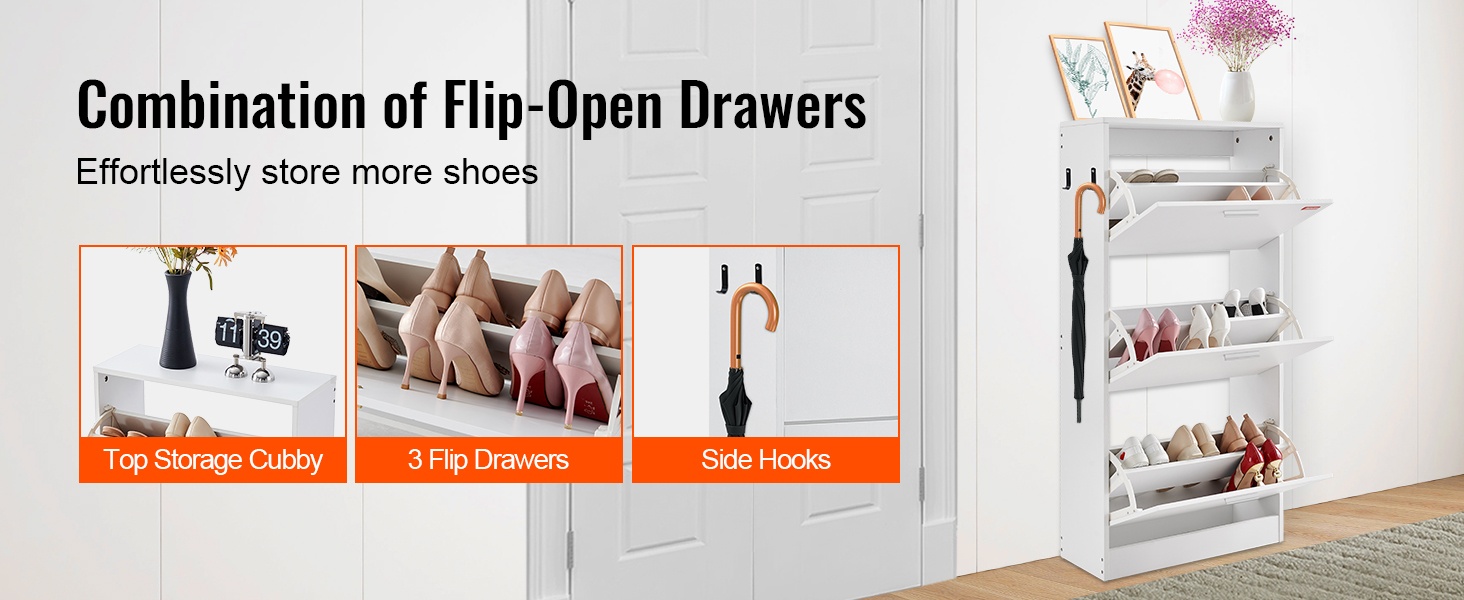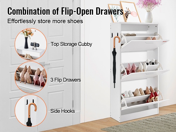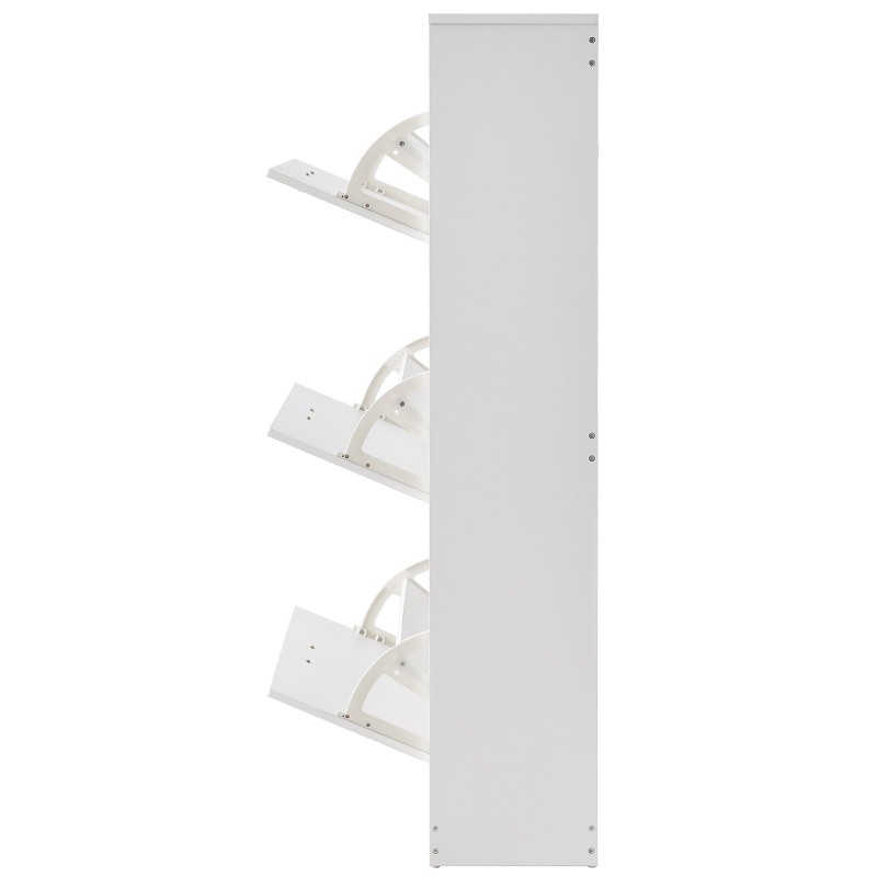 Tilaa säästävä kenkäkaappi, jossa on 3 ylös kääntyvää laatikkoa. Laatikoiden flip-mekanismi helpottaa kenkien ottamista ja palauttamista, ja kengät pysyvät siististi piilossa, jolloin eteinen ja muut tilat pysyvät järjestyksessä. Neutraali, pelkistetty muotoilu sopii monenlaisiin sisustuksiin.