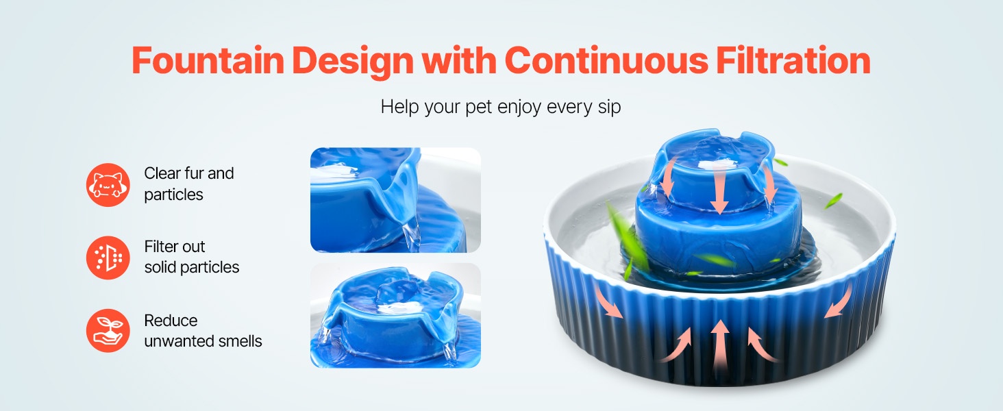 Keraaminen lemmikin juoma-allas, jonka tilavuus on 2.1 L ja 360° juoma-alue. Sileä, korkeassa lämpötilassa poltettu ja naarmuuntumista kestävä pinta on miellyttävä sekä kissoille että koirille. Kaksinkertainen suodatus pitää veden puhtaana, ja erittäin hiljainen 1.5W pumppu toimii alle 30 dB:n äänitasolla.