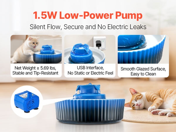 Matalaenergiainen 1.5W pumppu toimii hiljaisesti, joten allas sopii myös makuuhuoneeseen tai muihin hiljaisiin tiloihin. Vakaa ja kaatumista ehkäisevä rakenne, staattisuusvapaa ja sileä lasitettu pinta tarjoavat lemmikille rauhallisen ja turvallisen juomahetken.