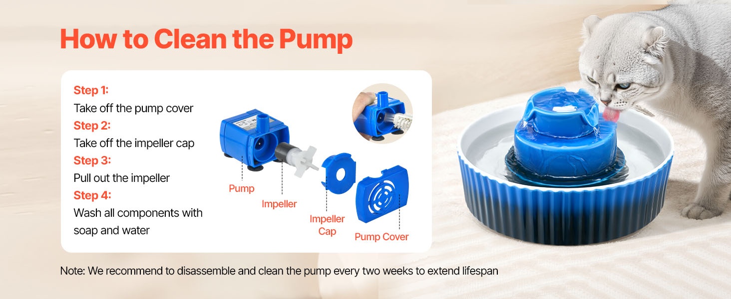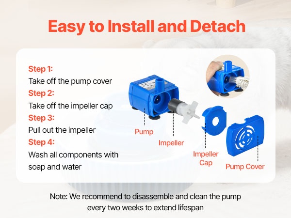 Suositeltu puhdistusväli on noin kahden viikon välein. Neljän yksinkertaisen vaiheen avulla pumppu on helppo purkaa, puhdistaa ja koota takaisin. Säännöllinen huolto pidentää pumpun käyttöikää ja varmistaa, että kiertovesijärjestelmä toimii tehokkaasti.