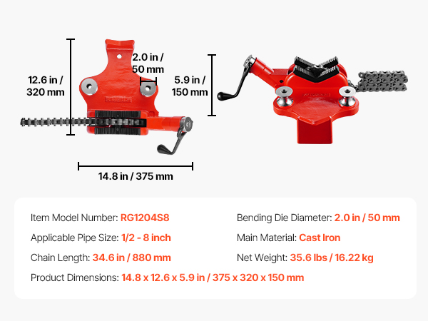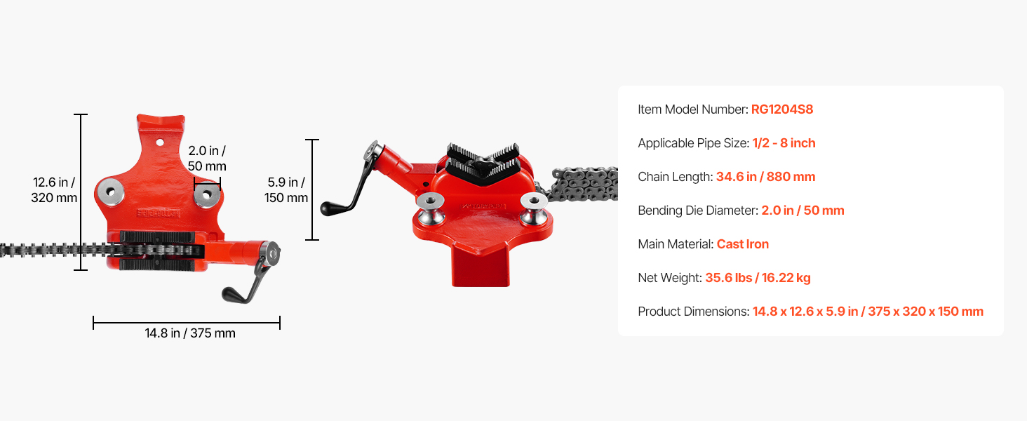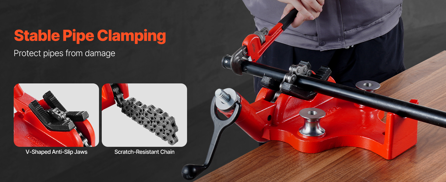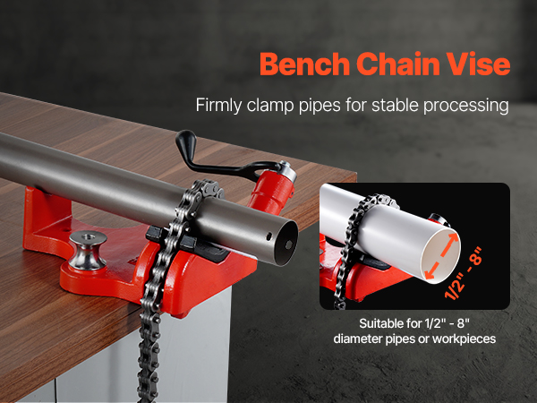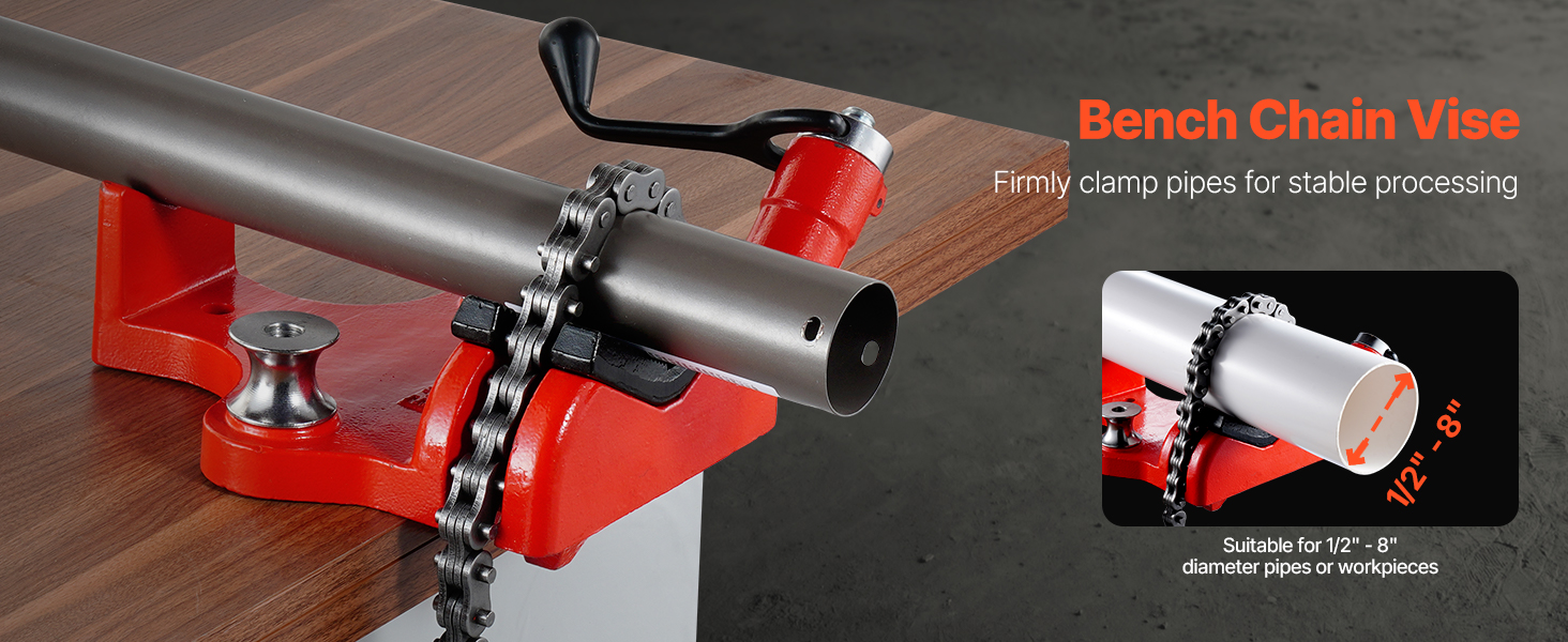 Penkkiin kiinnitettävä ketjuruuvipenkki, jossa on 34.6-tuumainen ketju, on suunniteltu putkien varmaan puristamiseen. Se pitää työn tukevasti paikallaan ja parantaa tarkkuutta putkien käsittelyssä. Sopii putkille ja työkappaleille, joiden halkaisija on 1/2"–8", joten se käy sekä kotikorjauksiin että teollisiin töihin.