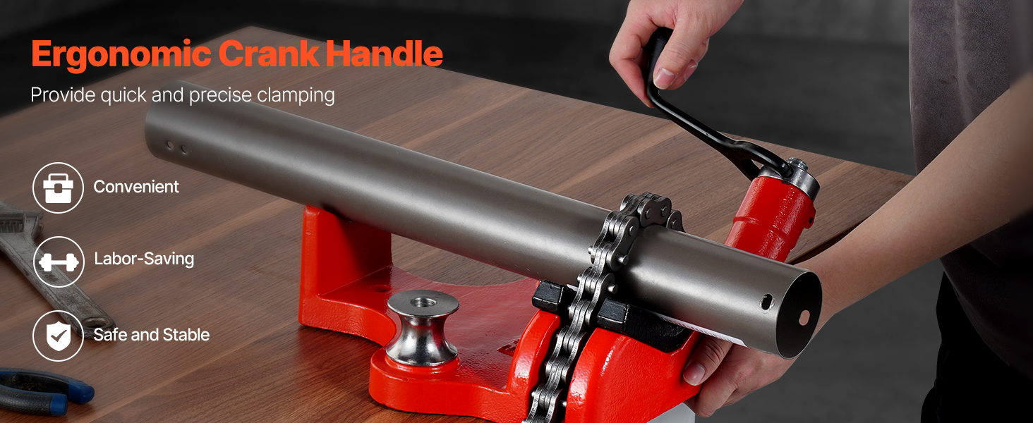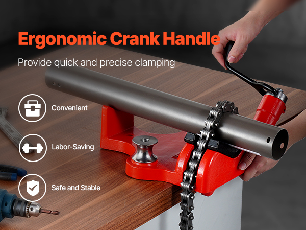 Tässä kierremallisessa penkkiketjuruuvipenkissä yhdistyvät ergonominen kampikahva ja raskas valurautapohja. Rakenne on vakaa ja turvallinen, joten se soveltuu monenlaisiin putkien käsittelytöihin.