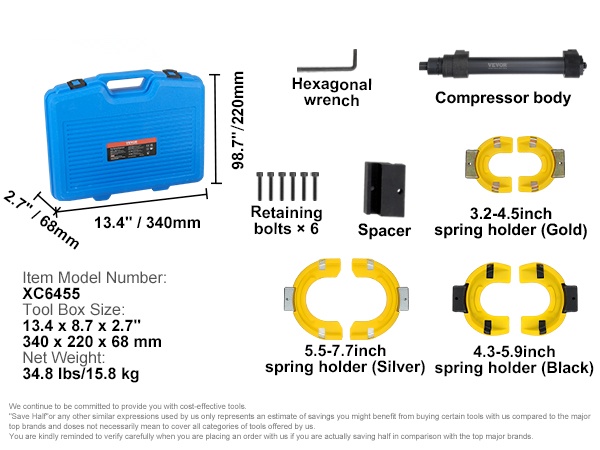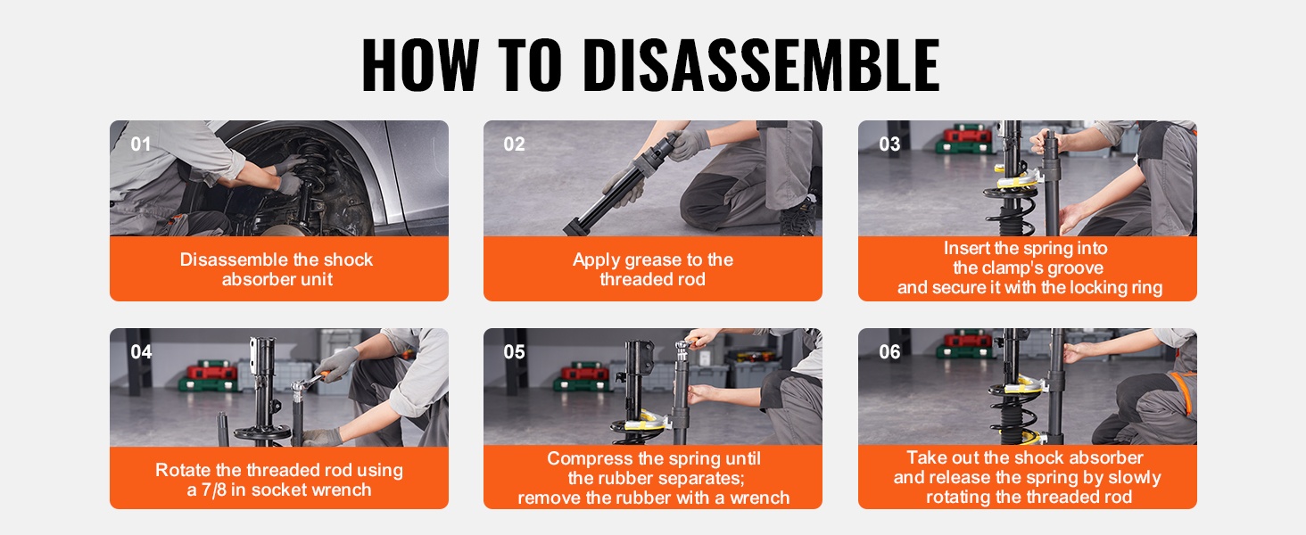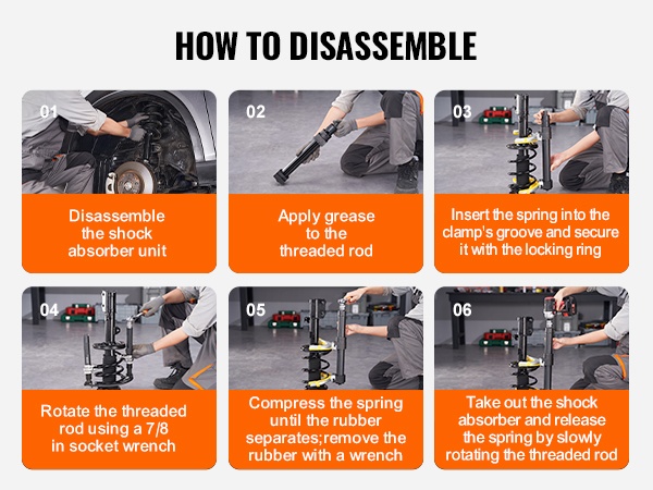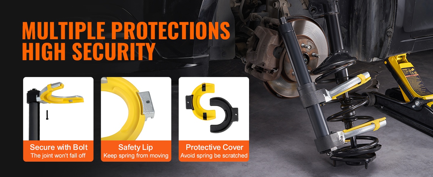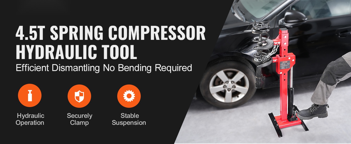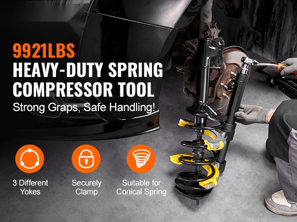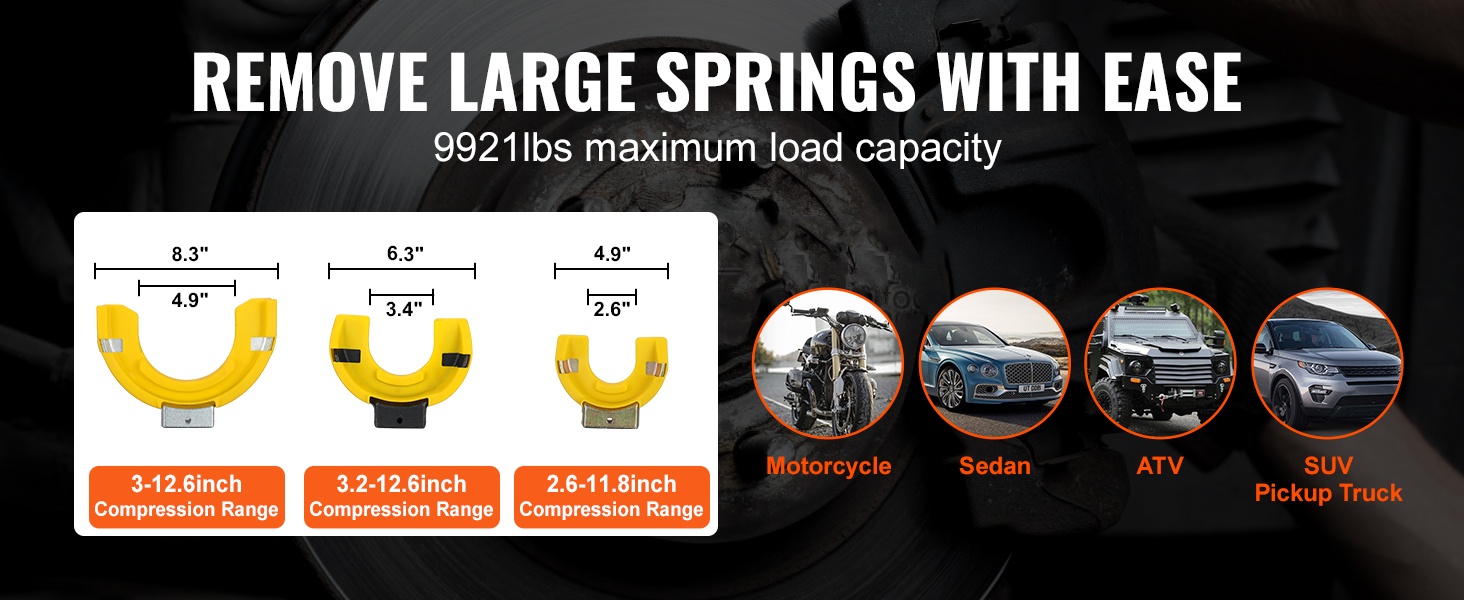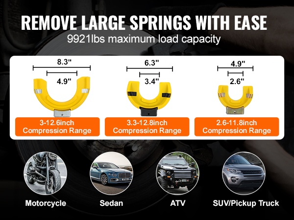 Työkalun 2646 lbs / 1200 kg kuormankesto ja laaja puristusalue helpottavat erikokoisten kierrejousien purkua ja asennusta. Voit irrottaa ja asentaa iskunvaimentimien jousia moottoripyöristä, henkilöautoista, maastoautoista ja kuorma-autoista sujuvasti ja hallitusti.