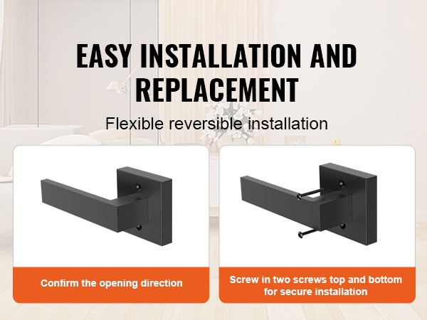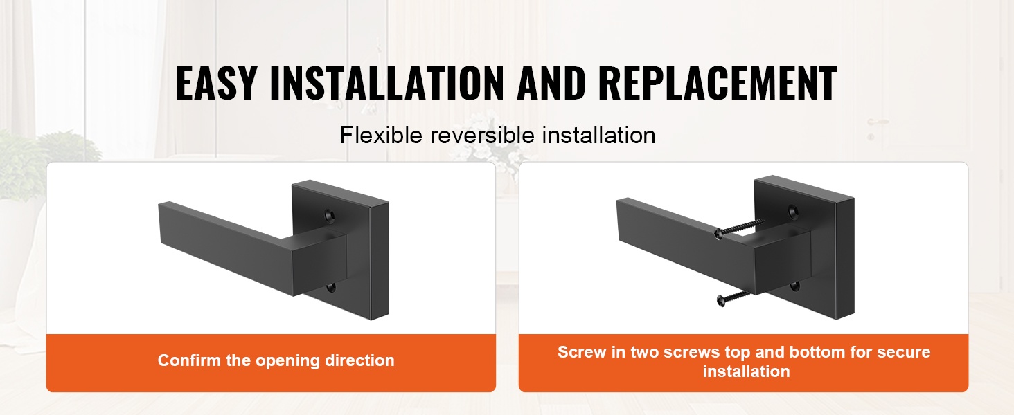 Musta ovenpainike on helppo asentaa ilman monimutkaista porausta. Tarvitset vain oven ja ruuvimeisselin. Seuraa kahta yksinkertaista vaihetta, niin kahva kiinnittyy tukevasti paikalleen ja oven ulkonäkö säilyy siistinä ilman tarpeettomia reikiä.