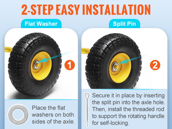 Pyörien asennus on suoraviivainen: akselille asetetaan pyörä, litteät aluslevyt ja sokat. Erikoistyökaluja ei tarvita, kun akselin mitat vastaavat pyörän mittoja.