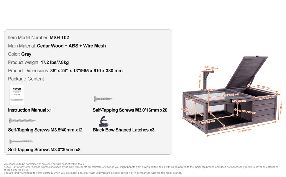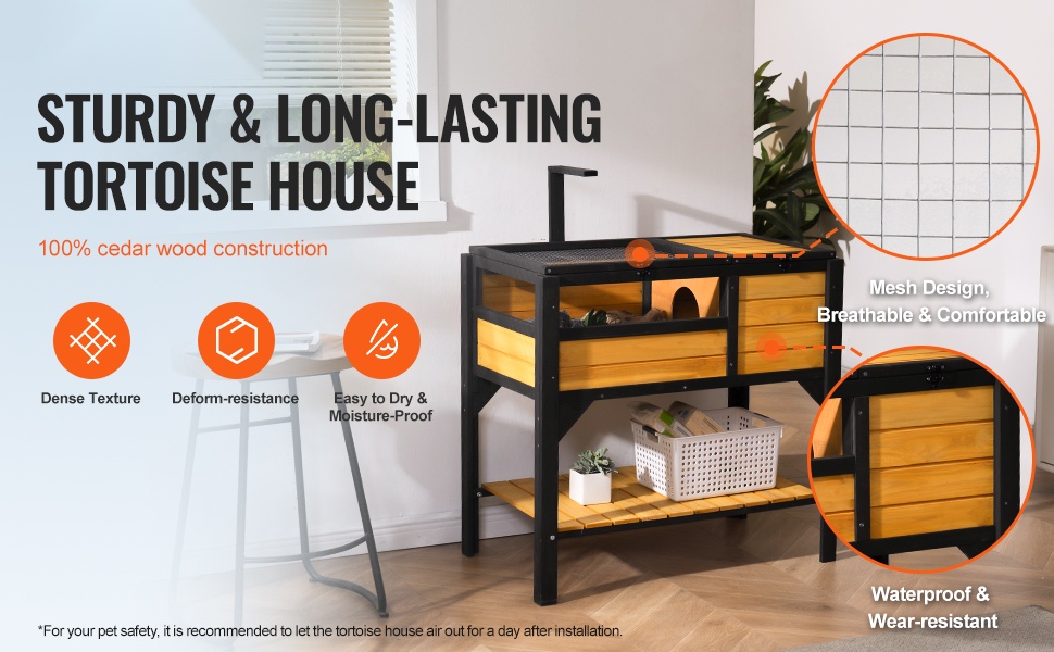 Tämä puinen kilpikonnan asumus tarjoaa tilavan ja suojaisan ympäristön sekä sisä- että ulkokäyttöön. Kestävästä seetripuusta valmistettu rakenne ja vedenkestävä ulkopintakäsittely auttavat suojaamaan koteloa säältä ja kulumiselta. Tiheäsilmäinen metalliverkkokansi pitää lemmikin turvassa ja mahdollistaa hyvän ilmanvaihdon.