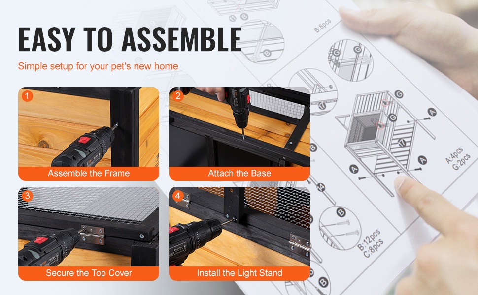 Kaikki paneelit on esiporattu ja merkitty kokoamisjärjestyksen mukaan. Selkeä ohje tekee kasaamisesta suoraviivaista, joten voit koota kotelon nopeasti lemmikkiä varten.