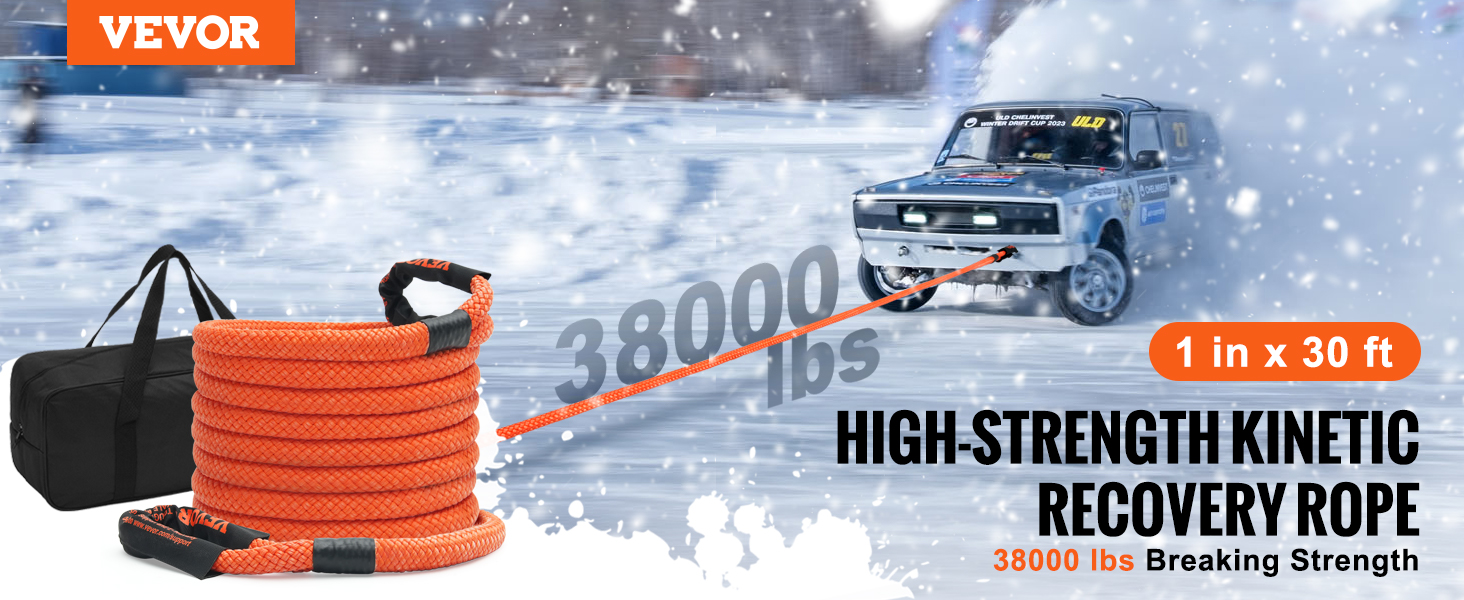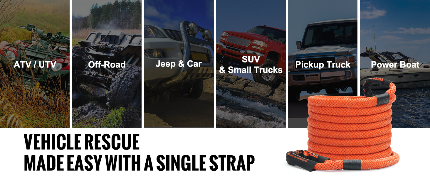 Kineettinen vetoköysi raskaaseen käyttöön maastoajoon ja hätätilanteiden hinauksiin. Kestävä nylonmateriaali, korkea katkeamismurtolujuus ja noin 30% venymä takaavat pehmeän, hallitun vedon ja vähentävät iskuja ajoneuvojen välillä.