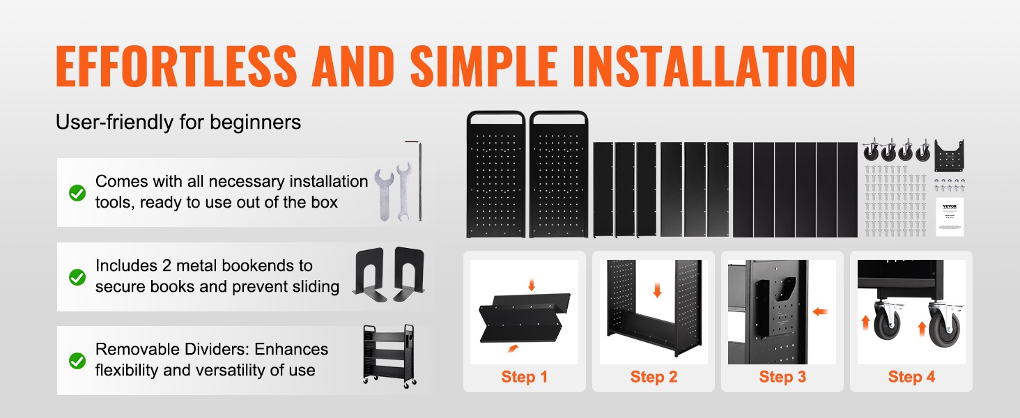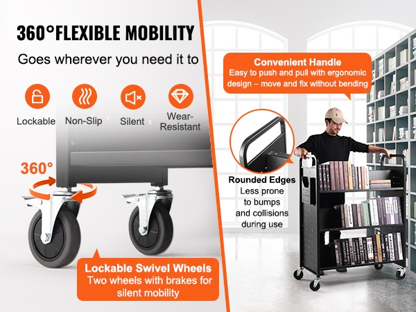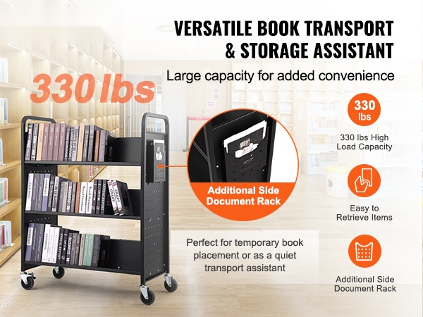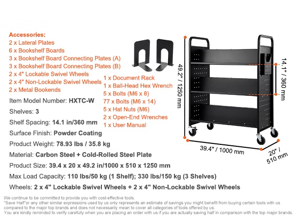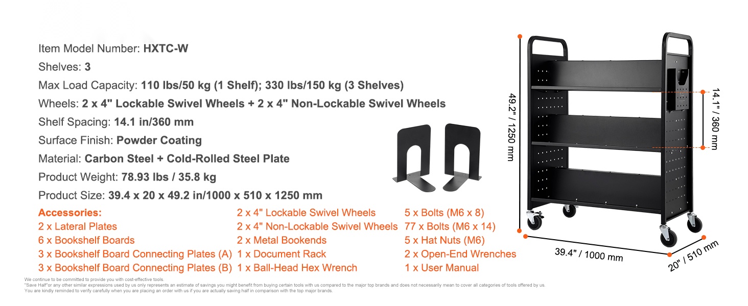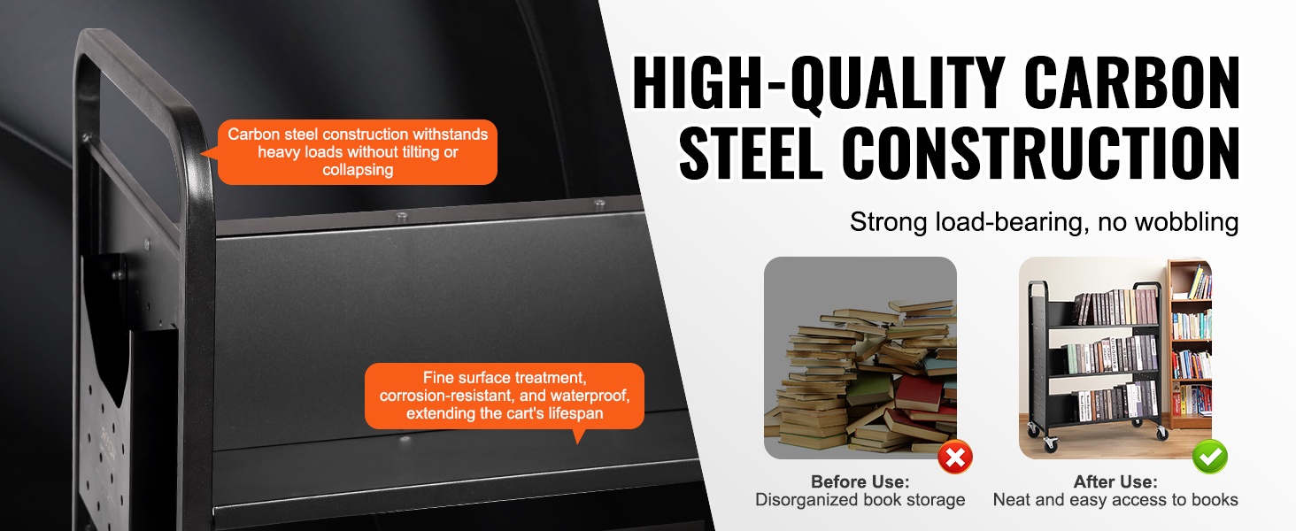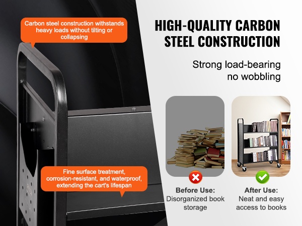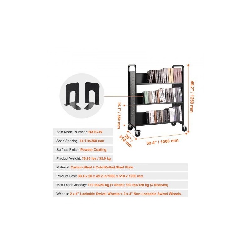 Tämä tukeva kirjavaunu on valmistettu kestävästä hiiliteräksestä ja kylmävalssatusta teräslevystä. Enimmäiskuormitus on yhteensä 330 lbs/150 kg (110 lbs/50 kg per hylly), joten vaunu sopii hyvin kirjojen, kansioiden ja muun materiaalin siirtämiseen ja säilyttämiseen kirjastoissa, kouluissa, toimistoissa ja kotona.