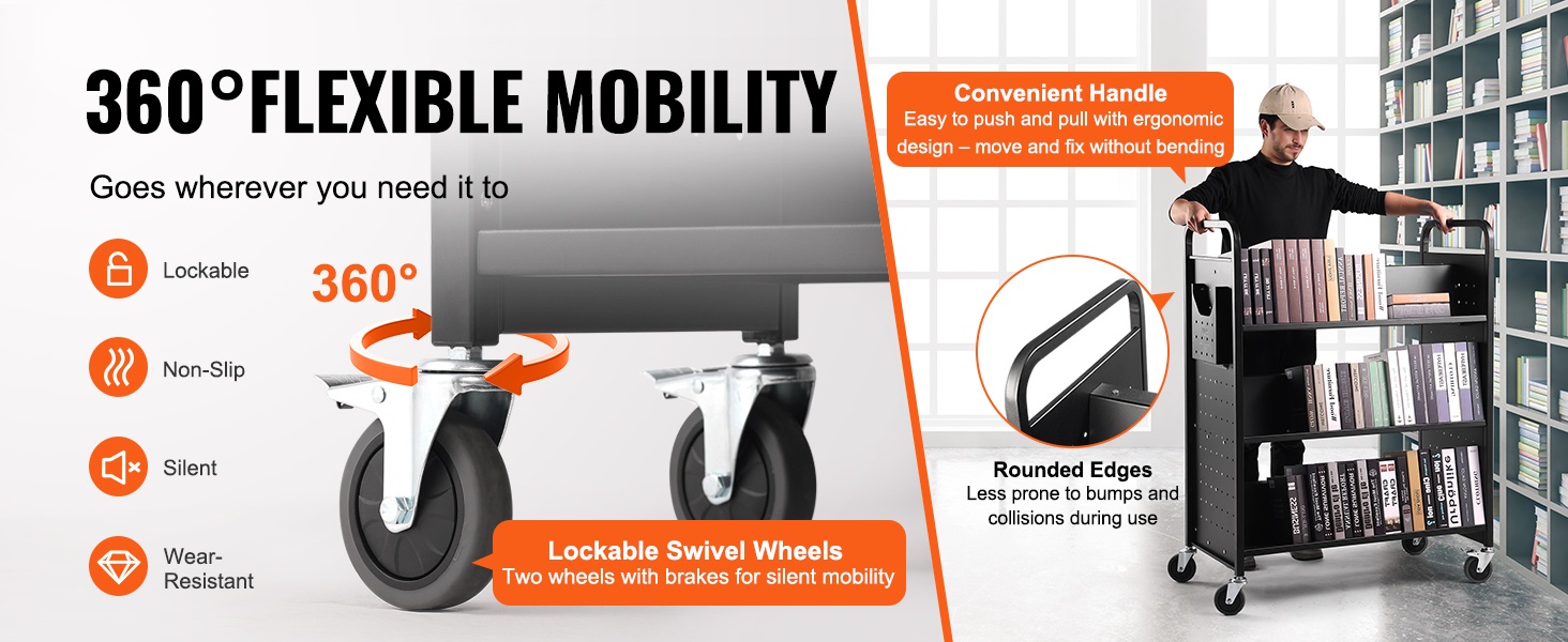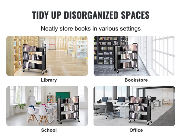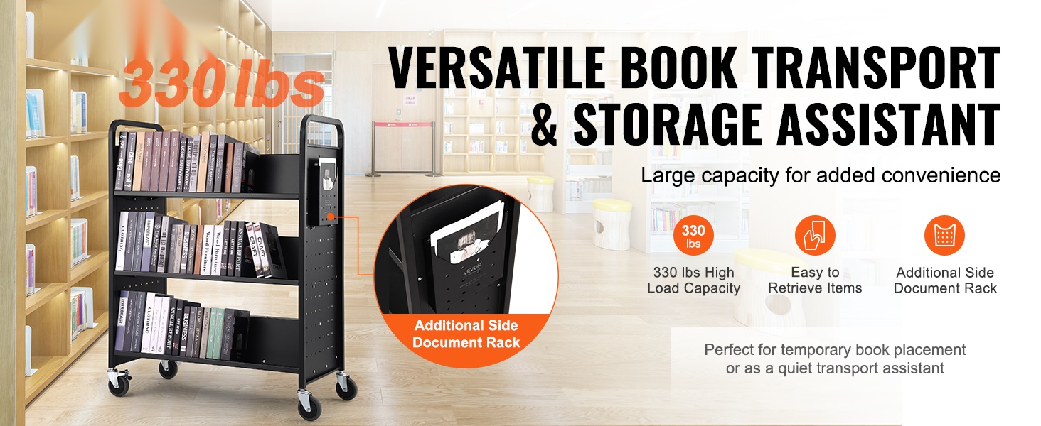 Sopii erinomaisesti kirjastoihin, kouluihin, toimistoihin, kirjakauppoihin ja kotiin. W-muotoiset hyllyt helpottavat erilaisten kirjojen, oppikirjojen, dokumenttien ja esitemateriaalien lajittelua, kuljettamista ja esillepanoa.