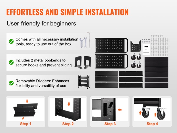 Kirjavaunu on helppo koota, ja kaikki tarvittavat kiinnitystarvikkeet sisältyvät pakkaukseen. Mukana tulevat 2 metallista kirjatukea, joiden avulla kirjat pysyvät siistissä rivissä eivätkä kaadu liikkeen aikana.