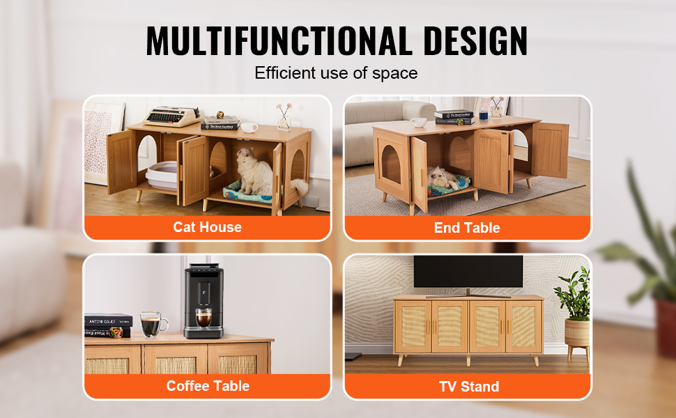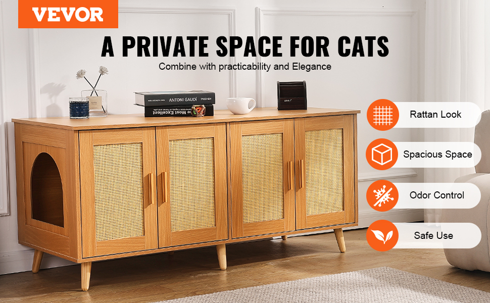Tilava rakenne tarjoaa kissalle yksityisen ja mukavan tilan. Hiekkalaatikko pysyy poissa näkyvistä, ja suljettu rakenne auttaa vähentämään hajujen leviämistä huoneeseen. Luonnollisen värinen puupinta ja rottinkikoristeiset ovet tekevät kaapista helposti yhdisteltävän erilaisiin sisustustyyleihin.