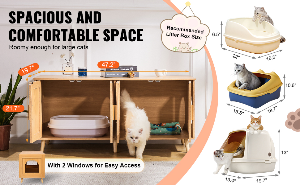 Kaappi on suunniteltu kahdelle kissalle ja sopii useimmille hiekkalaatikoille; sisätila on riittävän suuri piilottamaan hiekkalaatikon ja antamaan kissalle liikkumatilan.