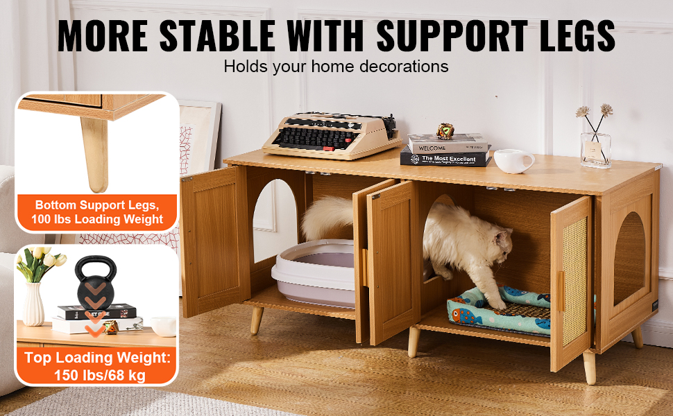 Ylätason kantavuus on 68 kg, joten sen päällä voi säilyttää kirjoja, kasveja, koriste-esineitä tai muita tarvikkeita. Lisätukijalkojen ansiosta alaosan kantavuus on 45 kg. Kaappi kätkee suurenkin hiekkalaatikon ja toimii samalla mukavana kissan oleskelupaikkana.