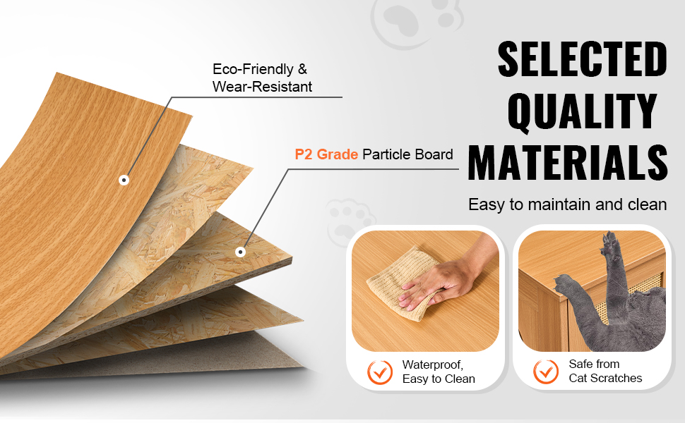 Rakenne on valmistettu P2-luokan lastulevystä, joka on tukeva ja turvallinen sekä lemmikille että omistajalle. Laadukas viimeistely on vedenpitävä ja kestää hyvin normaalia kulutusta sekä kissan kynsimistä. Kissan virtsa ja muut tahrat on helppo pyyhkiä pois, mikä helpottaa päivittäistä siivousta.