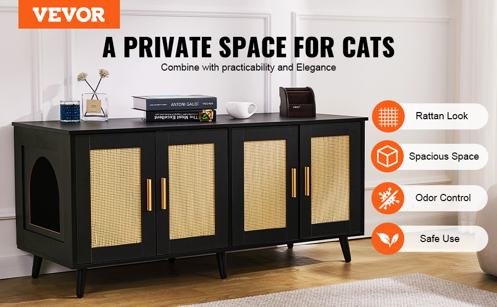 Tämä kissan hiekkalaatikon kaappi tarjoaa kissallesi oman rauhallisen ja mukavan tilan ja kätkee hiekkalaatikon siististi näkyvistä. Tyylikäs muotoilu sopii hyvin yhteen kodin sisustuksen kanssa ja tarjoaa samalla tilaa koriste-esineille ja arjen tavaroille.