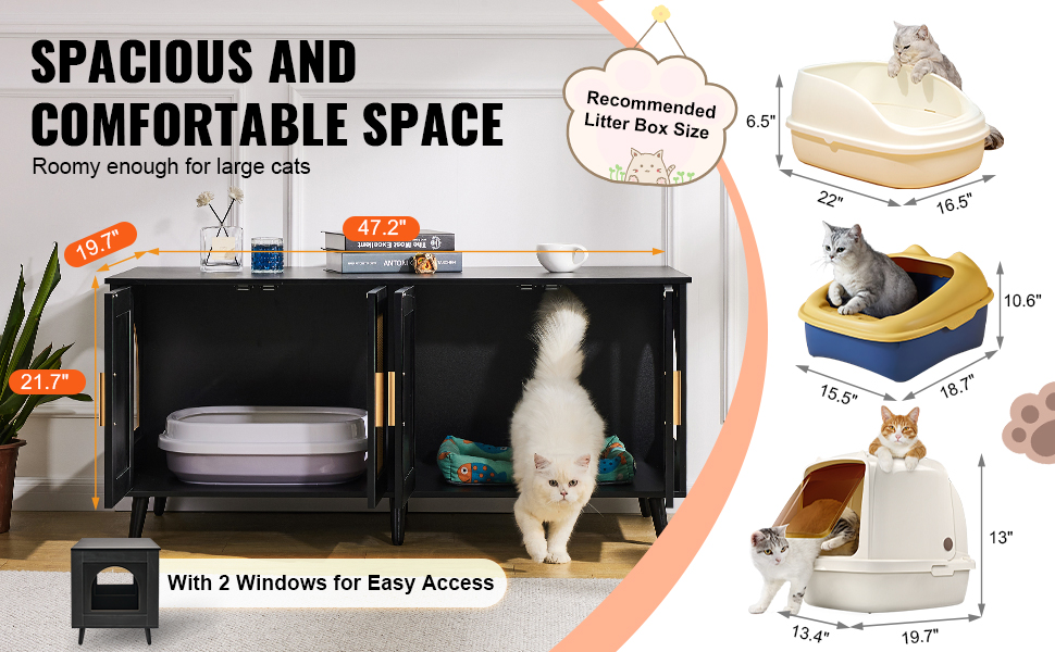 Suuressa tilassa on 2 ikkunaa, joiden kautta kissa pääsee kulkemaan vapaasti, samalla kun useimmat koirat eivät pääse sisään. Kissa saa rauhallisen ja suojaisan paikan. Riittävän suuri sisätila sopii useimmille hiekkalaatikoille ja tarjoaa runsaasti liikkumavaraa.