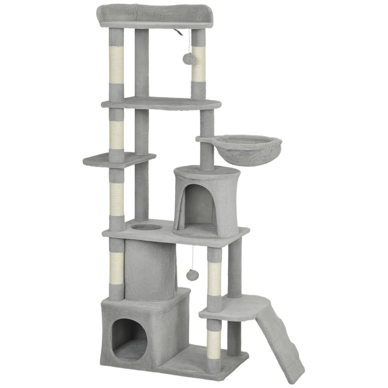 Tämä 170 cm korkea, vaaleanharmaa raapimapuu tarjoaa kissoillesi monipuolisen pystysuuntaisen leikki- ja lepoalueen yhteen kompaktiin kokonaisuuteen. Useat tasot, tunnelit, pesät ja riippumatto antavat kissoille mahdollisuuden kiipeillä, hyppiä, leikkiä, tarkkailla ympäristöä ja vetäytyä rauhassa lepäämään, samalla kun tukevat raapimapinnat suojaavat kotisi kalusteita.