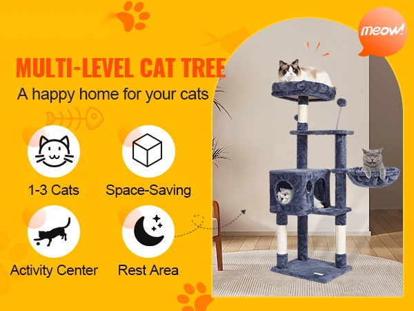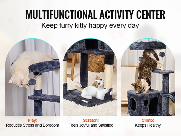 Tämä monitasoinen kissapuu tarjoaa sisäkissoille oman leikki- ja lepoalueen kompaktissa koossa. Useat tasot, hyppyalustat, piilokolo ja yläpeti antavat kissoille mahdollisuuden kiipeillä, tarkkailla ja vetäytyä omaan rauhaan. Riippulelu ja sisal-kääreiset raapimapylväät auttavat tyydyttämään luonnollista raapimis- ja leikkitarvetta.