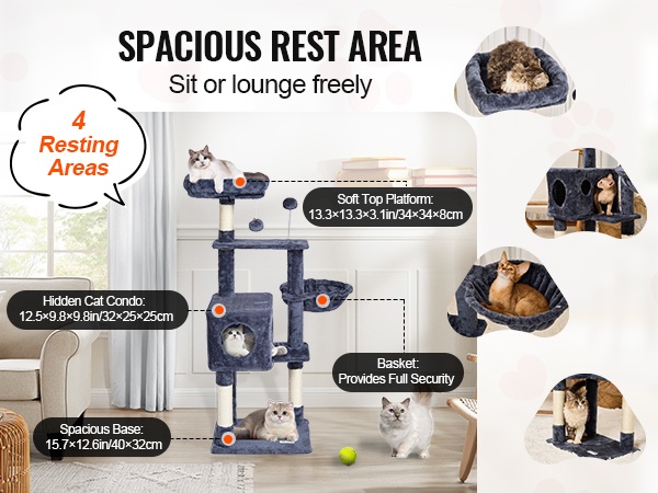 Neljän erilaisen lepopaikan – pohjatason, riippuvatun, piiloon jäävän kissakopin ja yläpedin – ansiosta jokainen kissa löytää helposti itselleen mieluisan paikan nukkua tai tarkkailla ympäristöä ylhäältä.