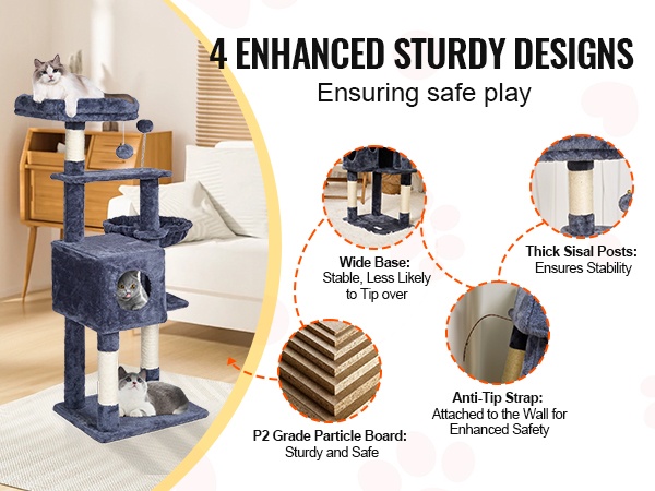 Kissat voivat tutkia ja levätä vapaasti useilla tasoilla. Tukeva pohjalevy ja vahvistetut sisal-pylväät lisäävät vakautta, jotta torni pysyy turvallisena myös aktiivisemmassa leikissä.