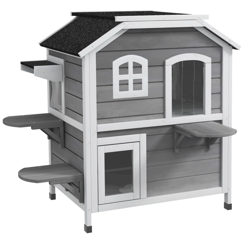 Kaksikerroksinen puinen kissatalo tarjoaa kissallesi suojaisan ja viihtyisän paikan ympäri vuoden. Se soveltuu sekä ulos että sisätiloihin, ja vedenpitävän rakenteen sekä asfaltin päällystämän katon ansiosta kissa voi levätä kuivassa ja turvassa myös kylmempinä ja sateisina päivinä. Tyylikäs harmaa-valkoinen ulkoasu sopii hyvin puutarhaan, parvekkeelle tai terassille.