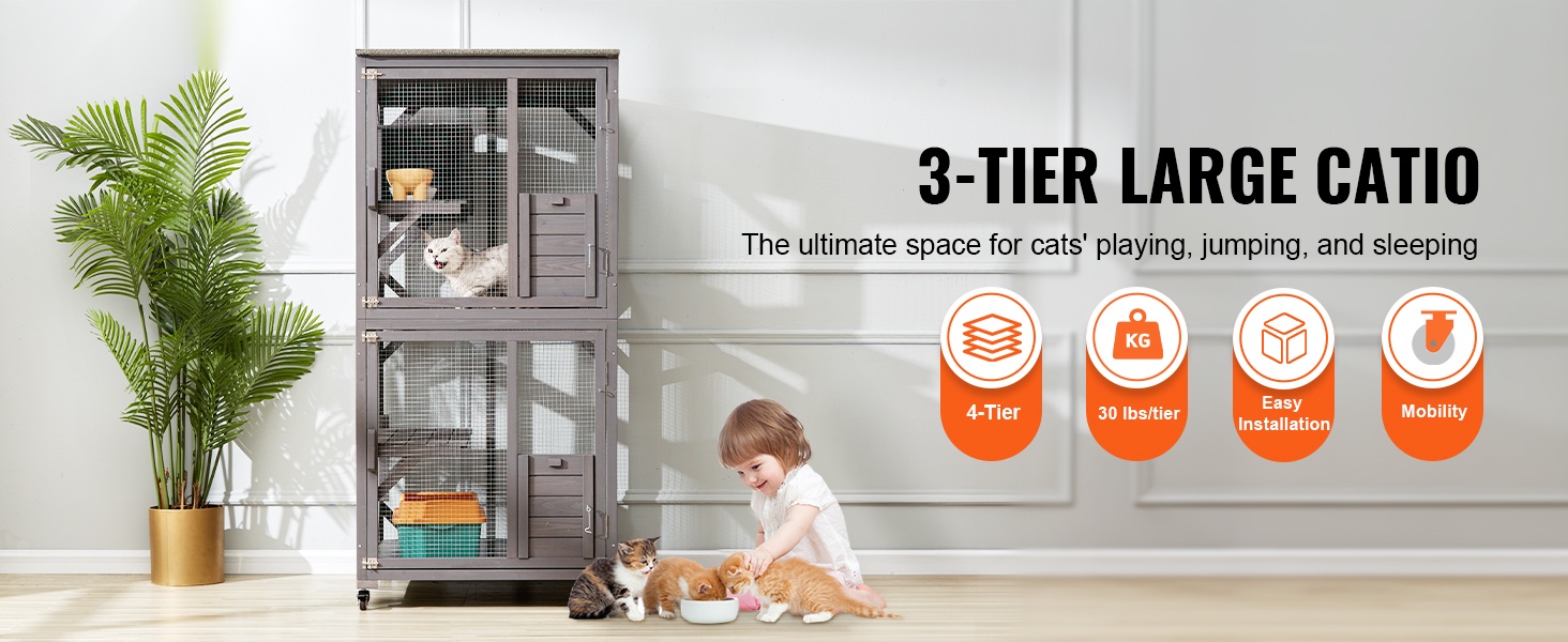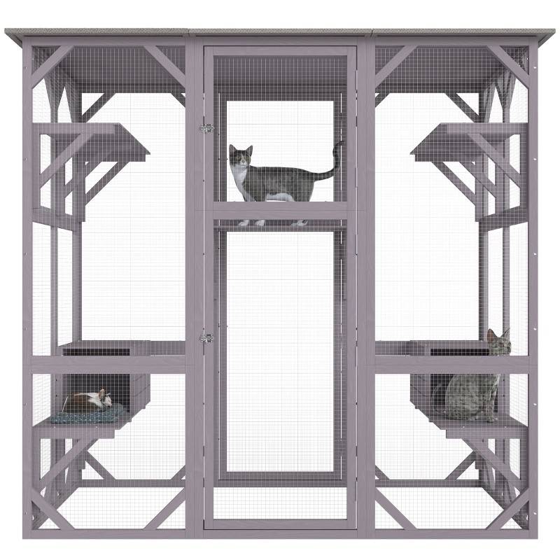 Tilava, seitsemän tasoa korkea kissatarha tarjoaa kissoille mukavan ja turvallisen oleskelu- ja leikkitilan ulos tai sisälle. Kestävät materiaalit, useat tasot ja kaksi lepotilaa tekevät rakenteesta viihtyisän useammallekin lemmikille.