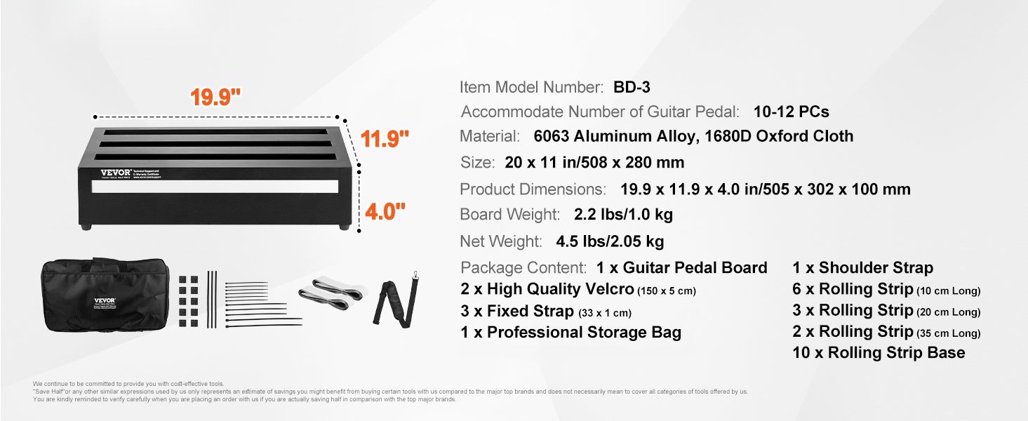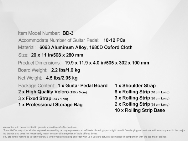 - Koko: 20'' x 11'' kitarapedaalilauta, tilaa 10–12 pedaalille