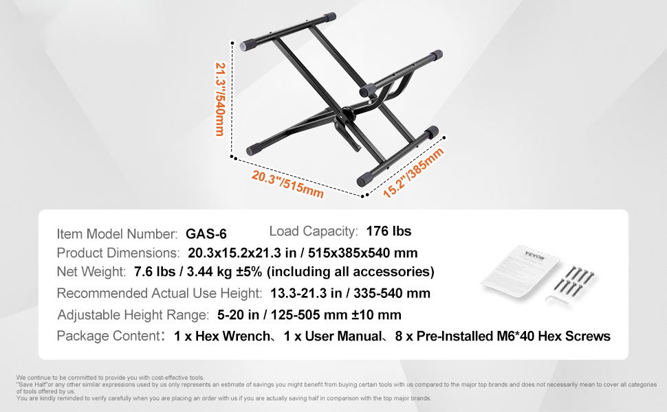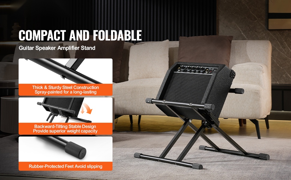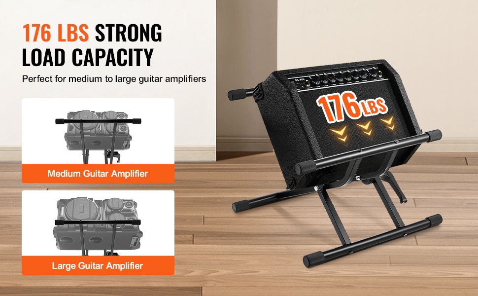 Vahvistintelineen kantokyky on 176 lbs/79.83 kg, joten se sopii vaivatta keskisuurille ja suurille kitaravahvistimille. Jäykät kumijalat parantavat pitoa ja varmistavat vakauden myös hieman epätasaisilla alustoilla.