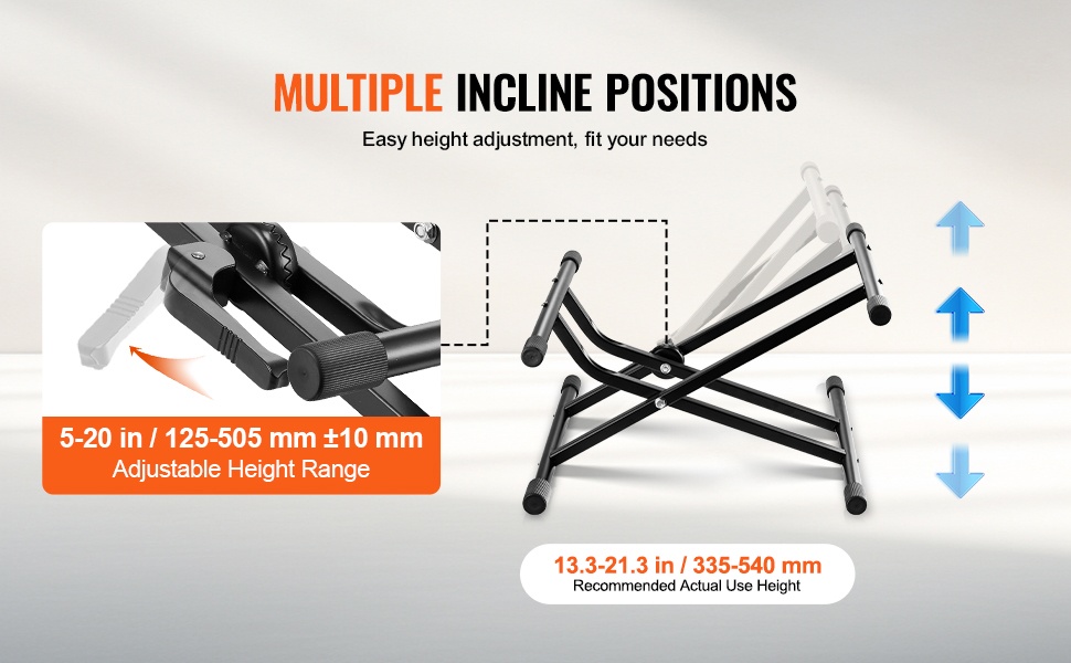 Korkeutta voi säätää 5–20 in (125–505 mm) välillä, jotta saat vahvistimen juuri sopivalle korkeudelle omaan soitto- tai kuunteluasentoosi. Näin ääni suuntautuu paremmin ja laitteisiin pääsee käsiksi helpommin.