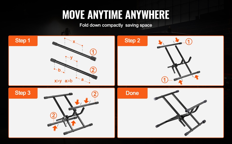 Telineen voi taittaa kasaan sekunneissa ilman monimutkaista purkamista. Tämä tekee siitä käytännöllisen ratkaisun treeneihin, keikoille ja liikkeellä oloon – teline mahtuu helposti mukaan ja vie vain vähän tilaa säilytyksessä.