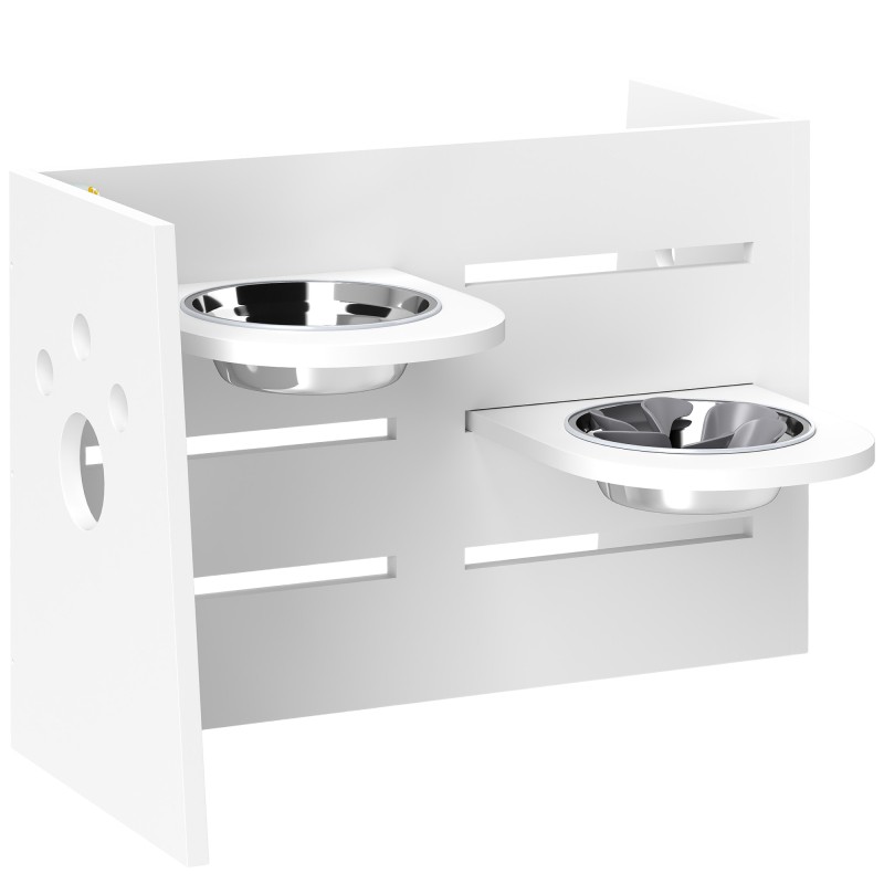 Koiran ruokintateline kahdella teräskupilla ja hidastavalla ruokailumatolla, korkeussäädettävä, valkoinen