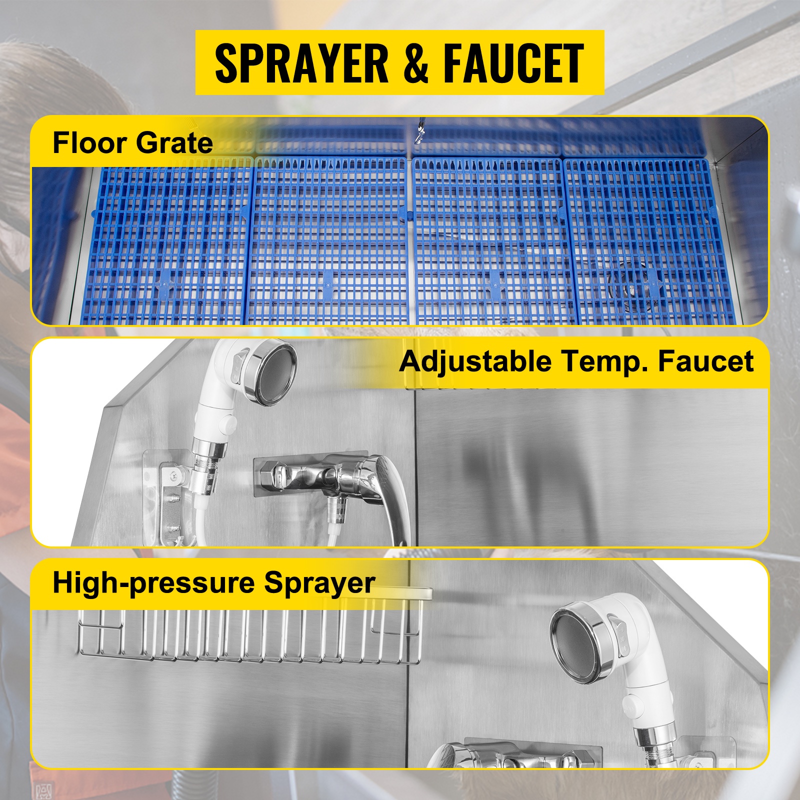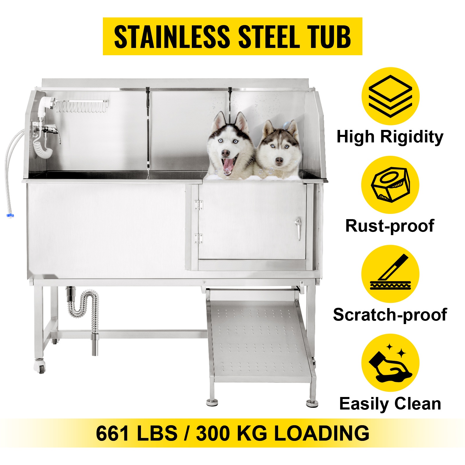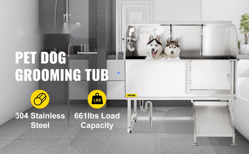 Lemmikkien pesuasema on valmistettu ruostumattomasta teräksestä, joten allas kestää jopa 661 lbs / 300 kg kuorman. Vankka rakenne tekee pesuhetkestä turvallisen ja vakaan myös suuremmille koirille.