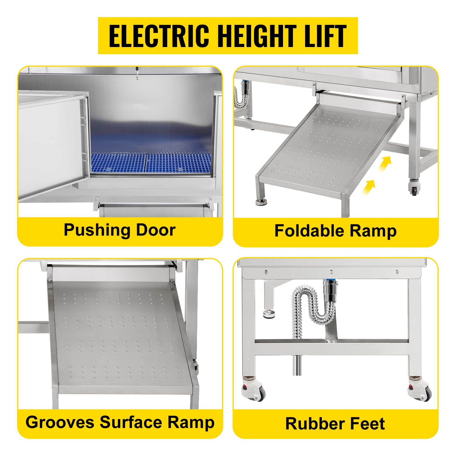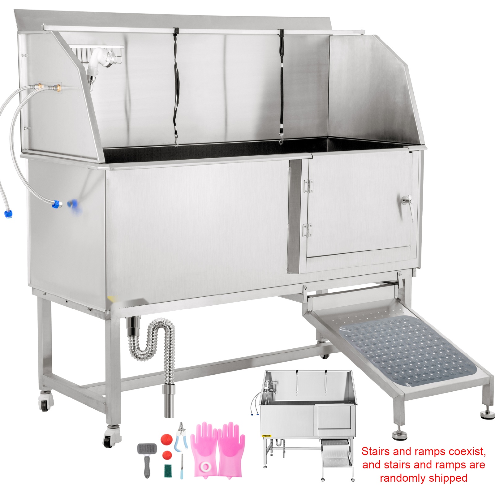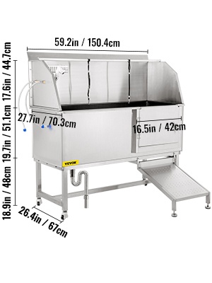 Tämä lemmikeille tarkoitettu pesuallas helpottaa koirien ja muiden lemmikkien pesua kotona, eläinlääkäriasemalla tai trimmaamossa. 304-ruostumattomasta teräksestä valmistettu rakenne on kestävä ja helppo pitää puhtaana. Altaassa on liukuovi, ramppi, säädettävä suihku, hana sekä viemäröintisarja, jotka tekevät pesuhetkestä sujuvan sekä lemmikille että omistajalle.