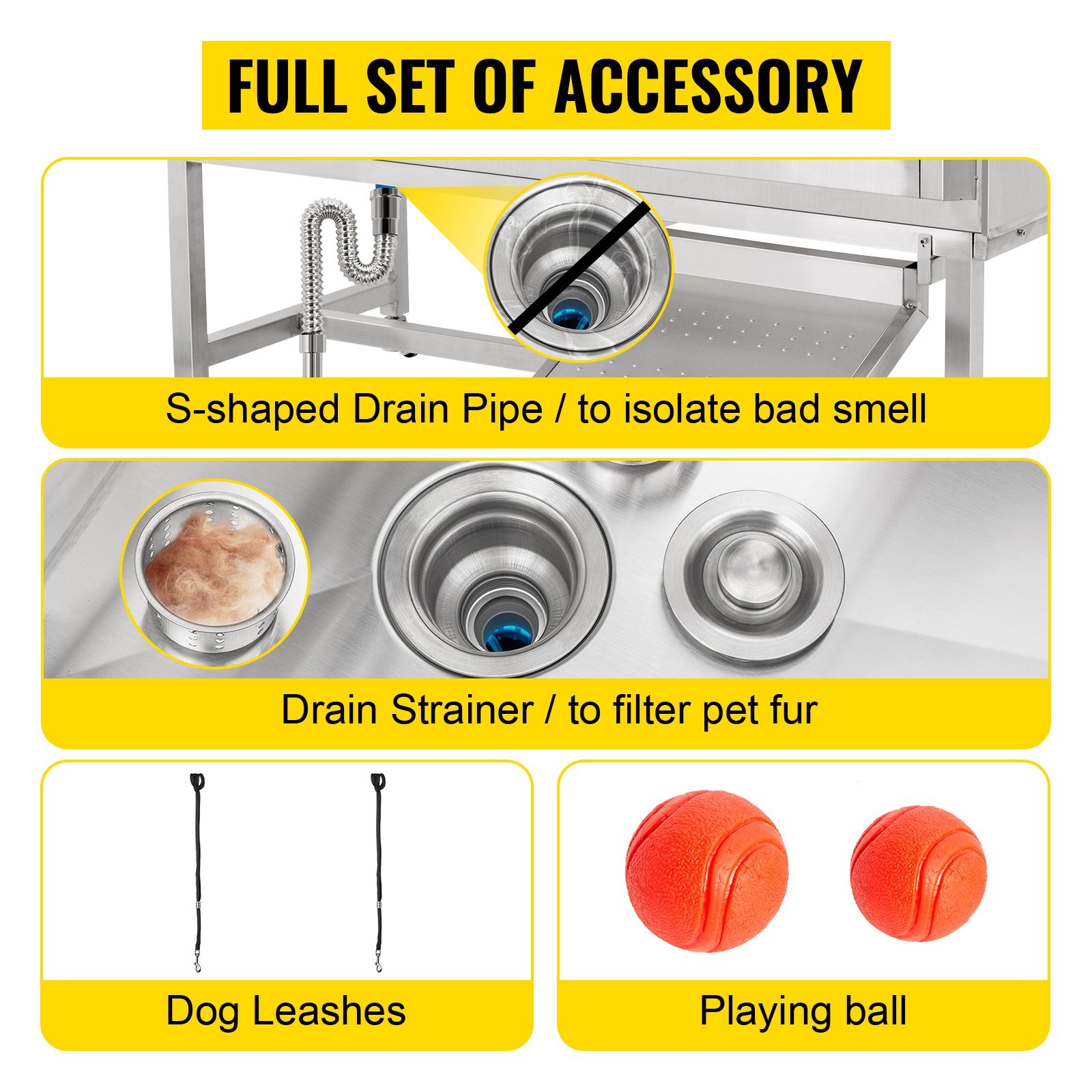 Ruostumattomasta teräksestä valmistettu viemärisarja kestää käyttöä paremmin kuin muoviset putket. Mukana tulevat talutushihnat ja punainen leikkipallo auttavat pitämään lemmikin paikallaan ja tekevät pesuhetkestä miellyttävämmän.