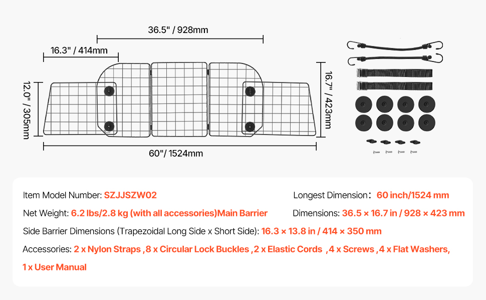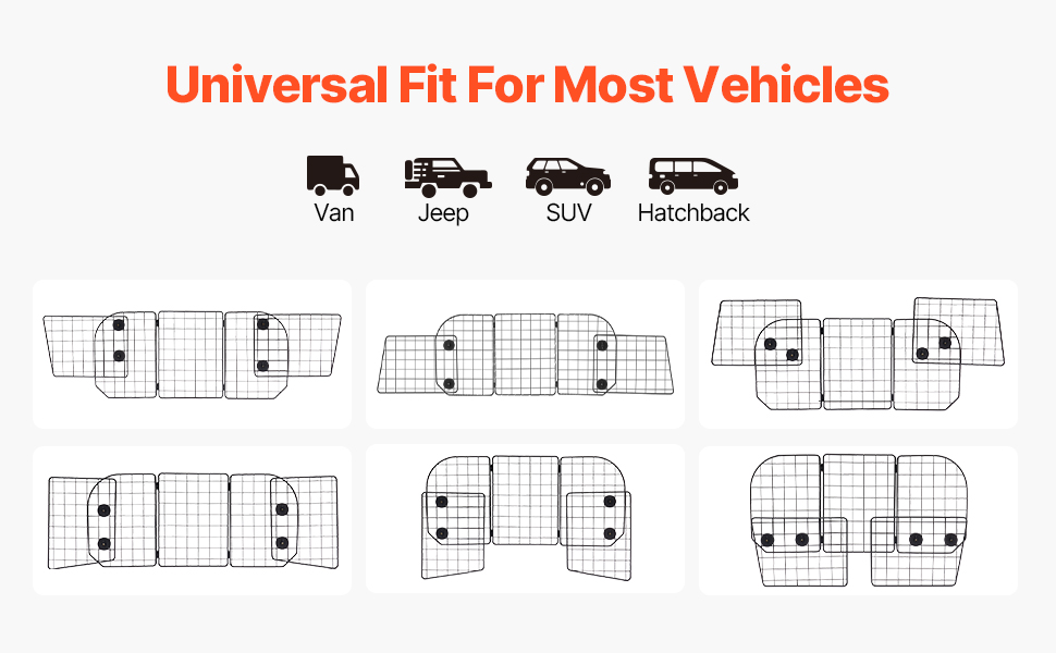 Tämä koiraeste tavaratilaan tarjoaa jopa 6 eri muotokokoonpanoa ja ulottuu enintään 1524 mm leveyteen. Verkkoa on helppo säätää ja laajentaa, jotta se sopii erilaisiin katumaastureihin, pakettiautoihin, maastoautoihin ja viistoperäisiin autoihin.