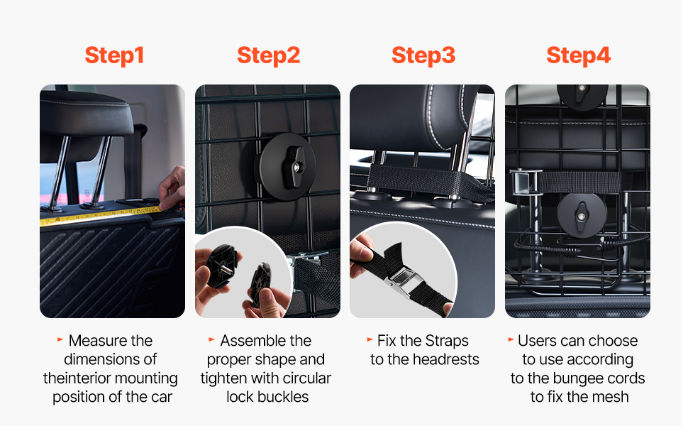 Koiran autoverkko on helppo asentaa ilman poraamista. Se kiinnitetään takaistuimen niskatukiin pyörölukoilla ja nailonhihnoilla. Mukana tuleva joustonaru antaa lisätukea ja auttaa varmistamaan, että este pysyy tukevasti paikoillaan.