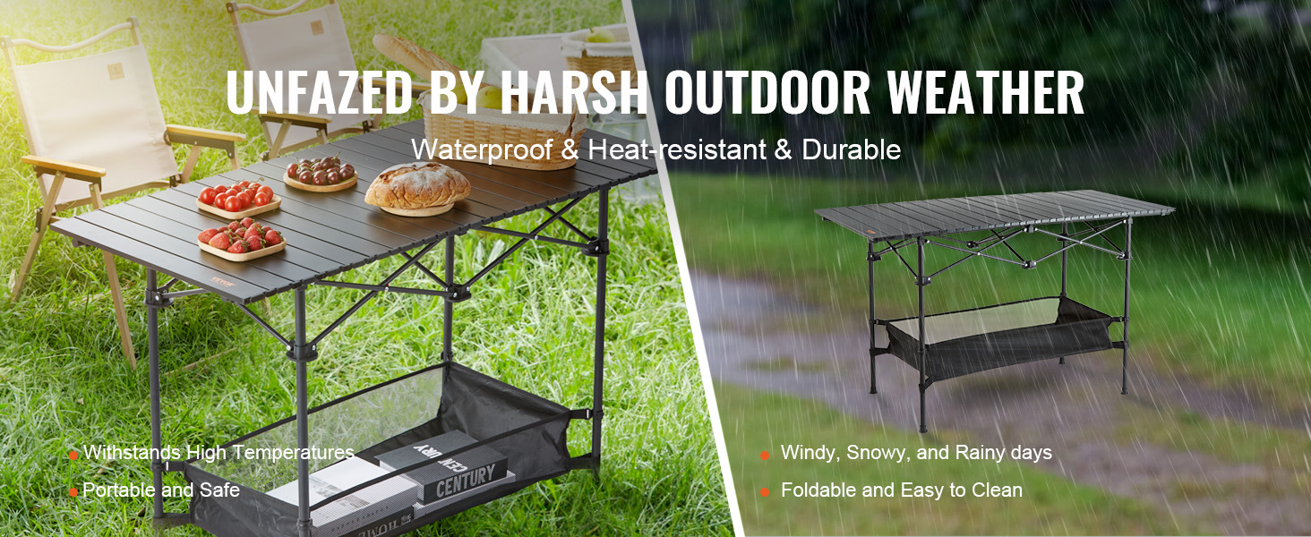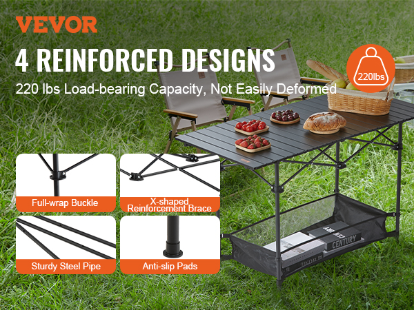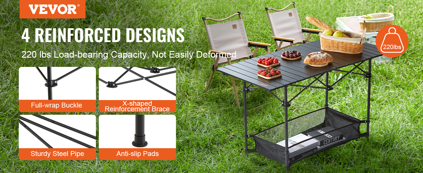 Pöytä tarjoaa miellyttävän ja kevyen ulkoilukokemuksen. Enimmäiskantavuus on , joten sinun ei tarvitse huolehtia kannen tai jalkojen vääntymisestä tai muodonmuutoksista, vaikka sijoittaisit pöydälle painavia esineitä.