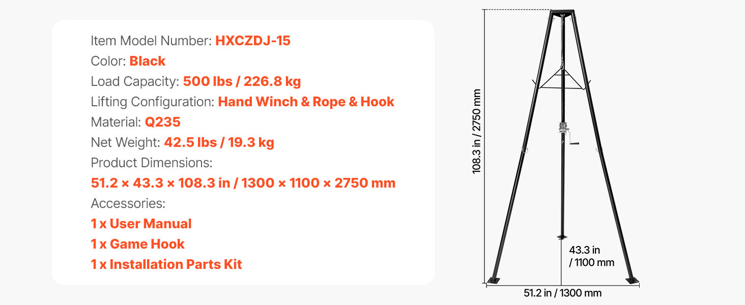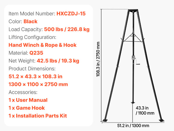 Kolmijalkainen riistanostin HXCZDJ-15, manuaalivinssi, kantavuus 226,8 kg, musta, Q235-hiiliteräs