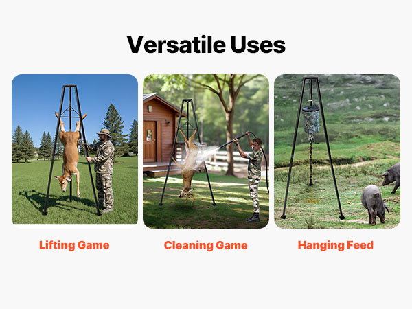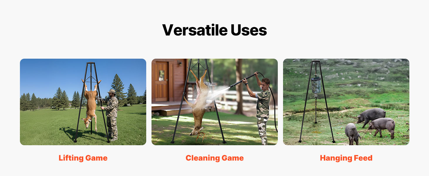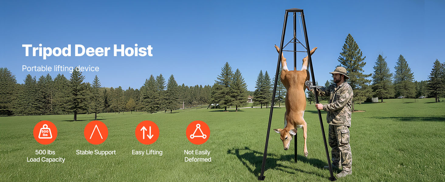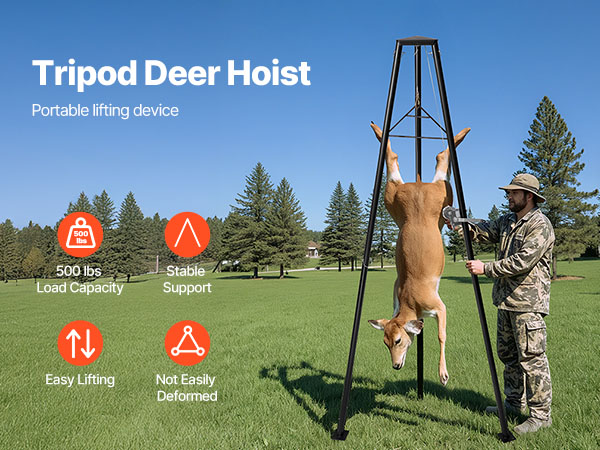 Tämä kolmijalkainen riistanostin on suunniteltu helpottamaan saaliin käsittelyä maastossa. Kolmionmuotoinen tukirakenne tarjoaa hyvän vakauden ja mahdollistaa jopa 226.8 kg kuorman nostamisen.