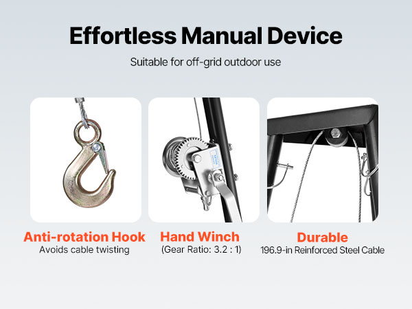 Suuren kapasiteetin käsivinssi helpottaa raskaiden taakkojen nostamista. Voit nostaa jopa 500 lbs painoisia riistaeläimiä tai muita raskaita esineitä ulko-olosuhteissa ilman lisävarusteita.