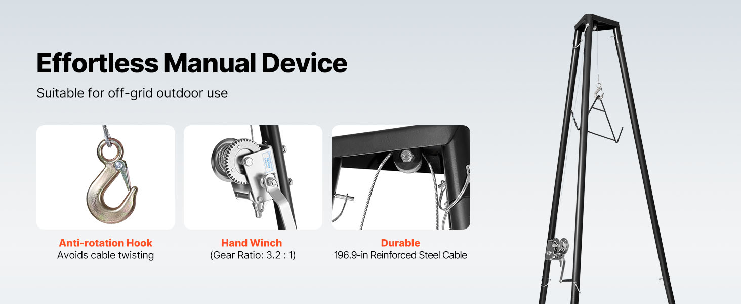 Pakettiin sisältyy kolmijalkainen tuki, manuaalinen vinssi, köysi ja koukku.