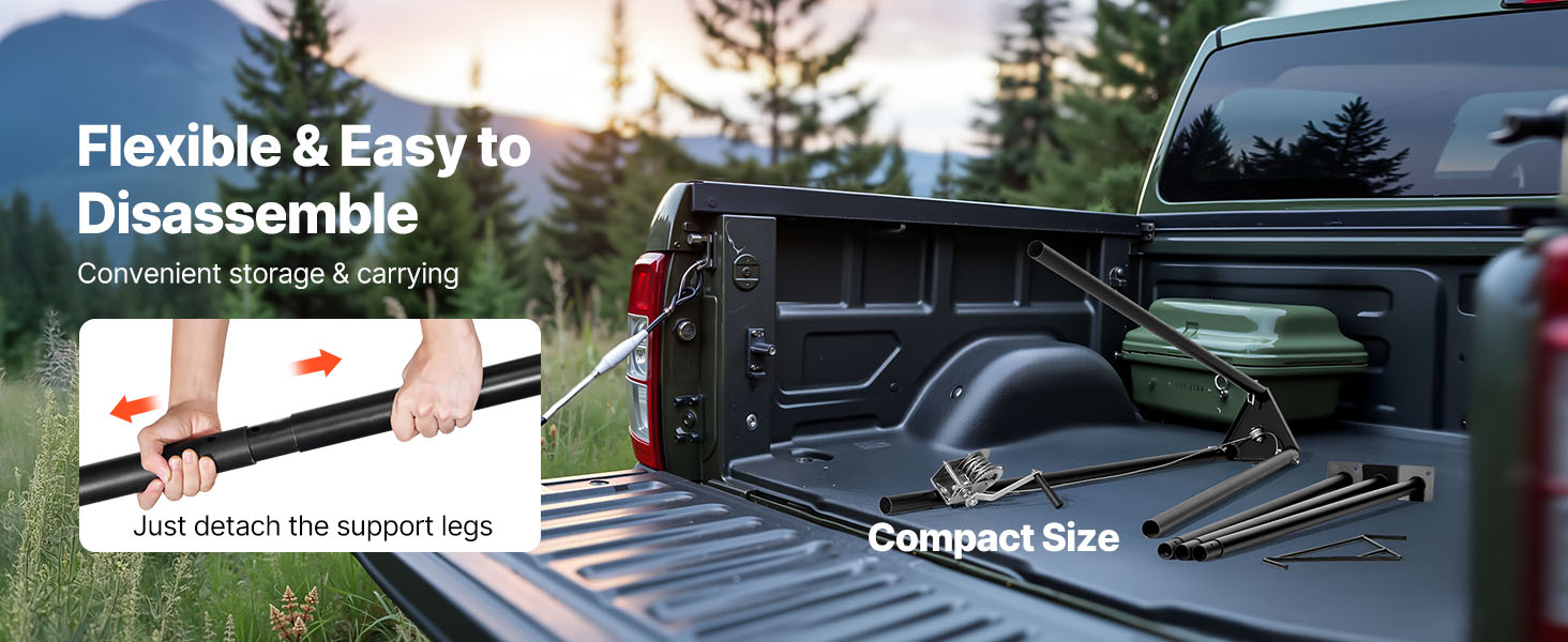 Kolmijalkarakenne on helppo purkaa osiin, mikä helpottaa säilytystä ja kuljetusta. Kompakti koko sopii auton tavaratilaan viemättä paljon tilaa, joten nostin on helppo ottaa mukaan metsästysreissuille.