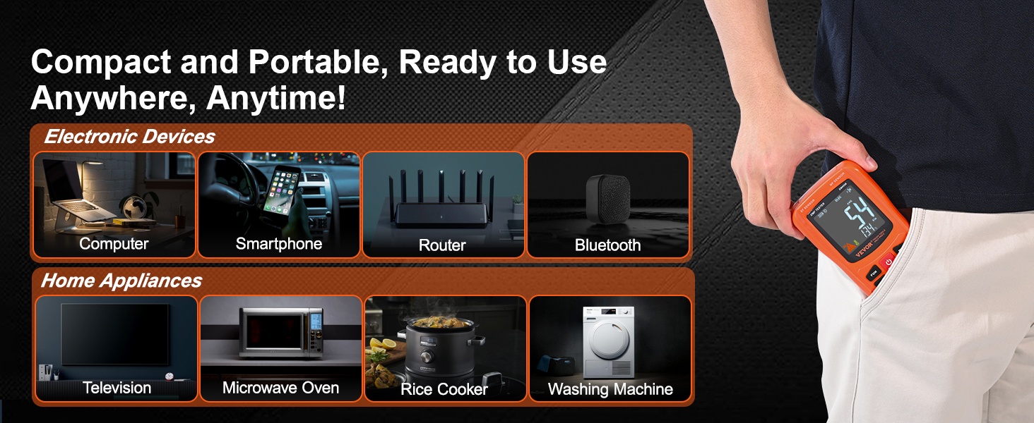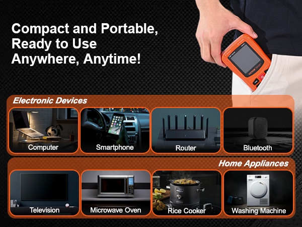 Mittari soveltuu esimerkiksi tietokoneiden, älypuhelinten, reitittimien, Bluetooth-laitteiden ja kodinkoneiden, kuten televisioiden, mikroaaltouunien, riisinkeittimien ja pesukoneiden lähellä esiintyvien sähkömagneettisten kenttien seurantaan. Laite sopii myös yleisiin kotitarkastuksiin ja ulkokäyttöön.