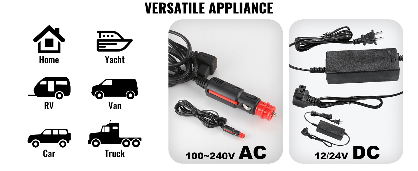 Pakkaukseen sisältyy 138-inch/3.5m auton tupakansytytinjohto sekä kotikäyttöön tarkoitettu verkkovirtamuunnin. Jääkaappia voi käyttää kotona, veneessä, asuntoautossa, autossa, kuorma-autossa, pakettiautossa ja monissa muissa ajoneuvoissa.