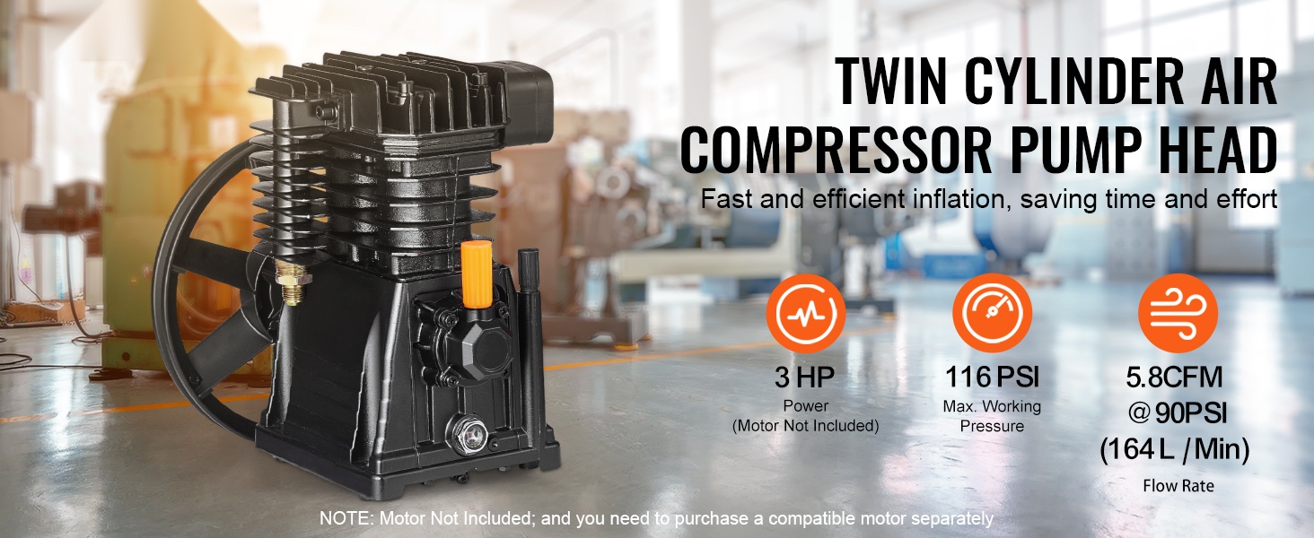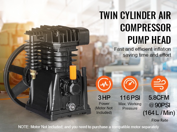 3HP kaksisylinterinen kompressoripää tuottaa ilmavirran 6.25 CFM @ 90 PSI ja maksimikäyttöpaineen 116 PSI. Yksivaiheinen kompressio takaa tasaisen ja riittävän paineilman esimerkiksi työkalujen, puhalluksen ja erilaisten täyttötöiden tarpeisiin.